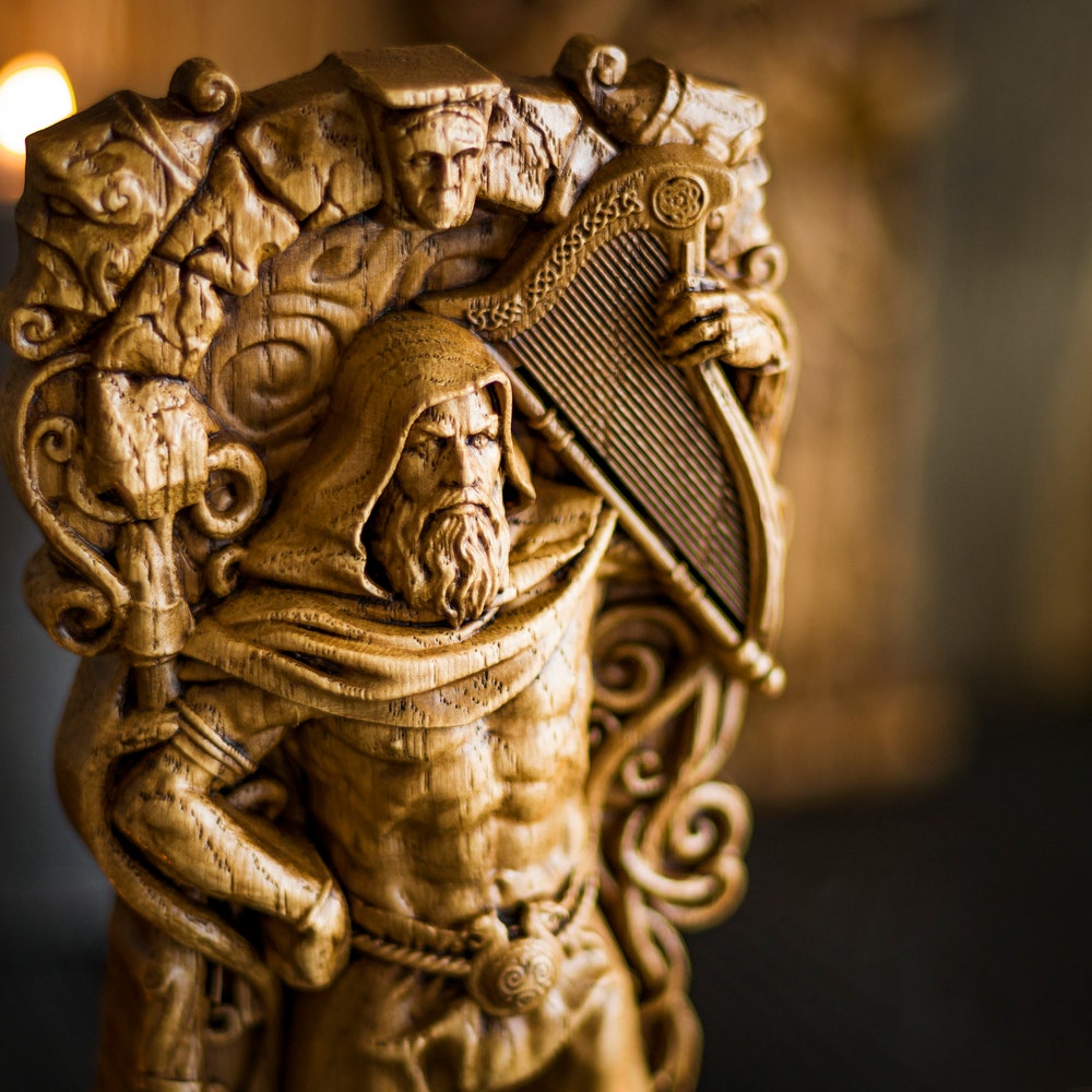 Handmade wooden statuette of Dagda carved out of oak wood.
