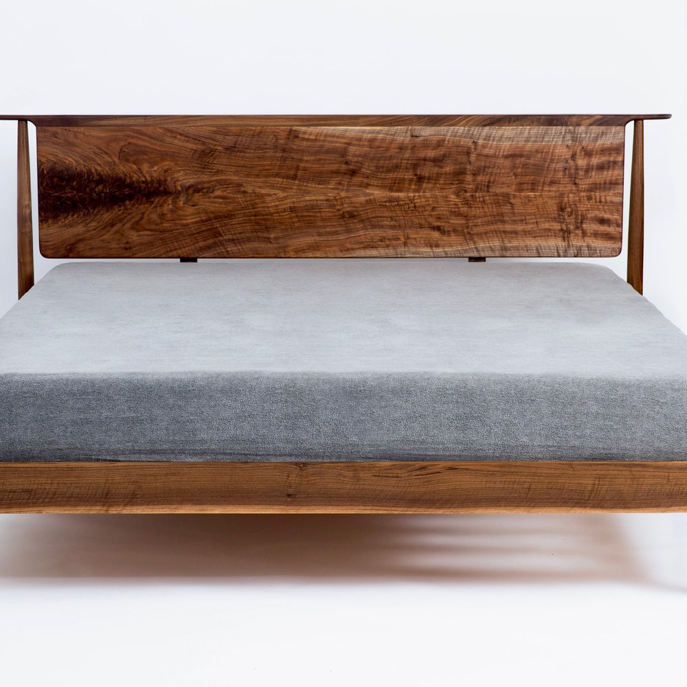This bed is made from all solid hardwoods using traditional joinery. Once the mattress is on the bed, the headboard has a floating look, covering the three supports from the headboard to the bed frame that give incredible strength and rigidity. All joints are hand sculpted to blend together.