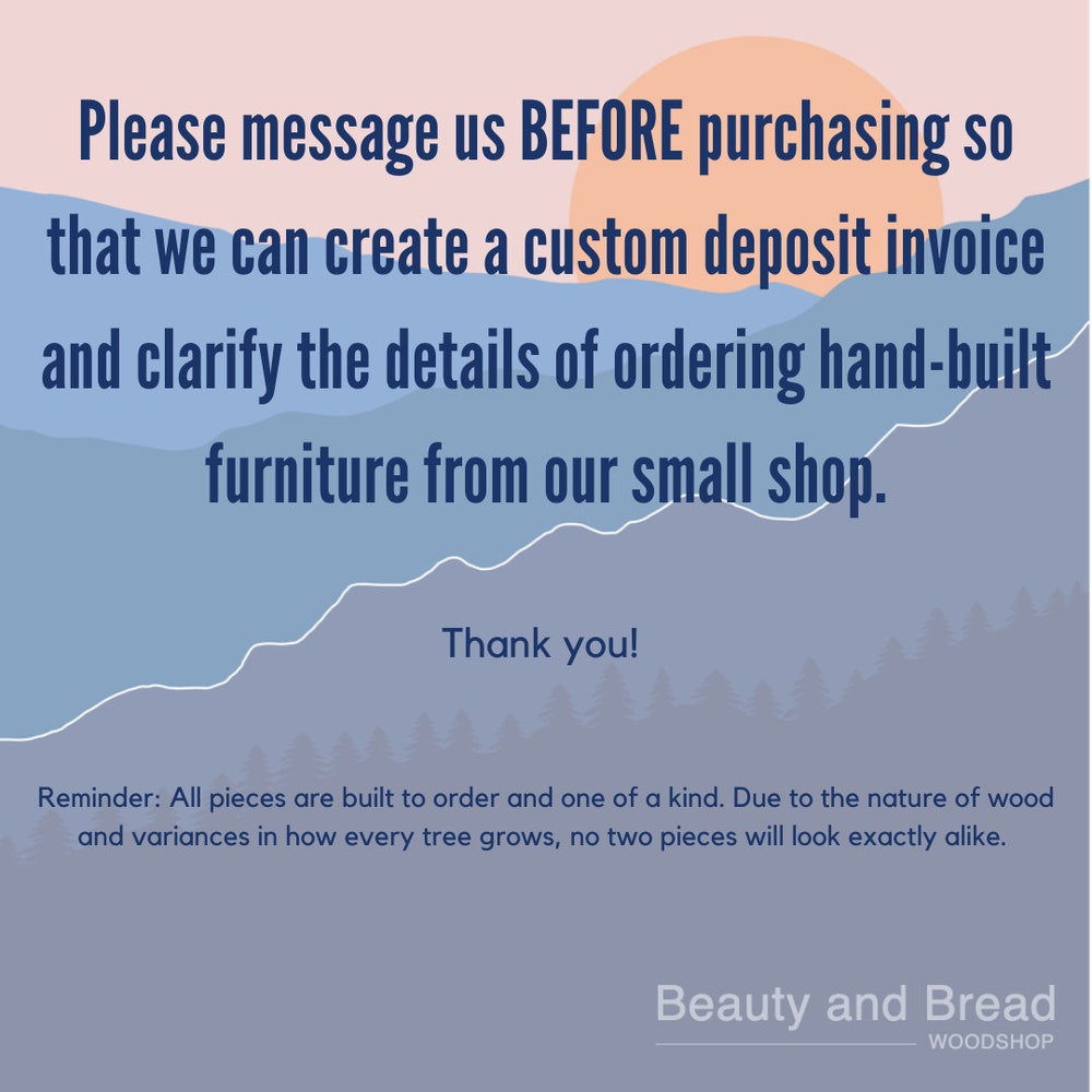 PLEASE READ DESCRIPTION AND CONTACT ME BEFORE PURCHASE – ALL PIECES BUILT TO ORDER LEAD TIMES: Varies, please inquire about current lead time and possible expedited options. Please feel free to call or text Casey at 360-909-5850 if you have any questions or would find it easier to chat more in more detail than messages […]