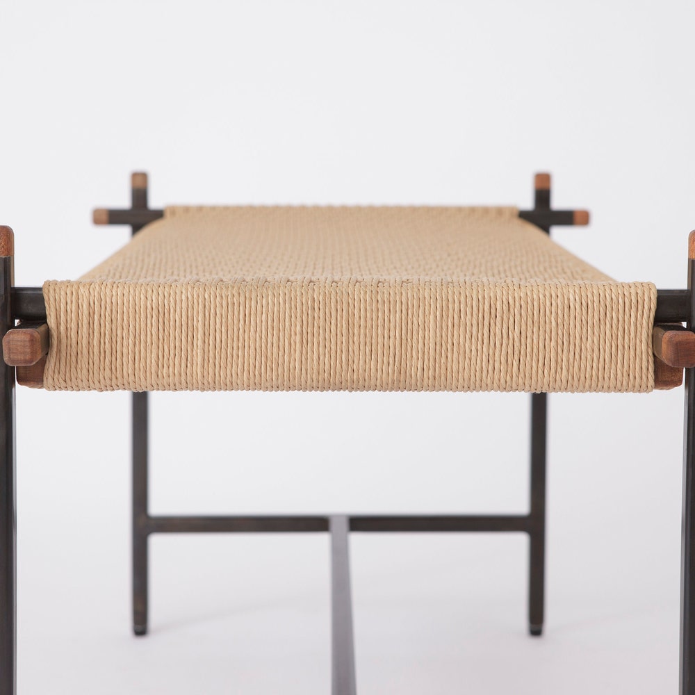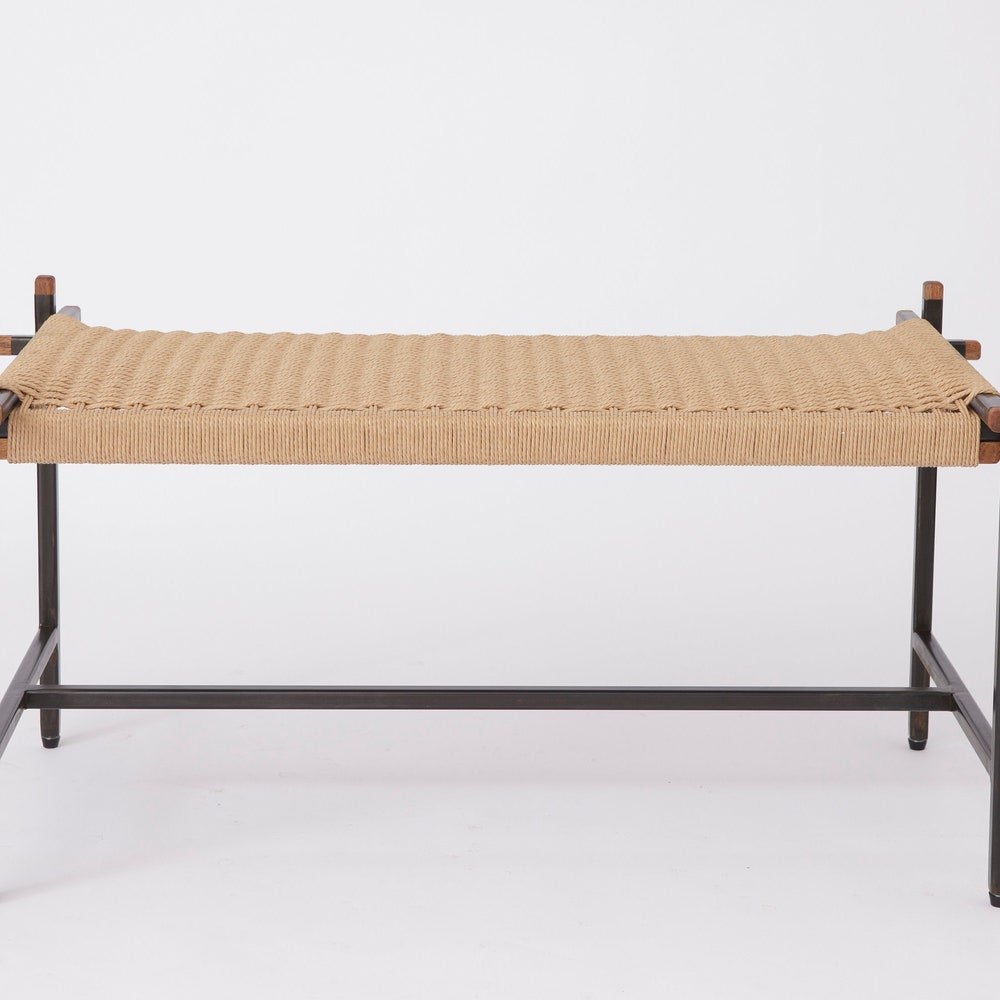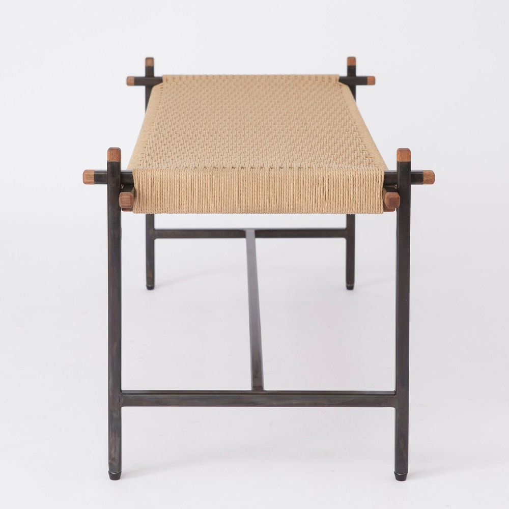 The “Danish Loft Bench” features a hand-welded steel frame, custom mahogany end caps and a hand-woven seat.