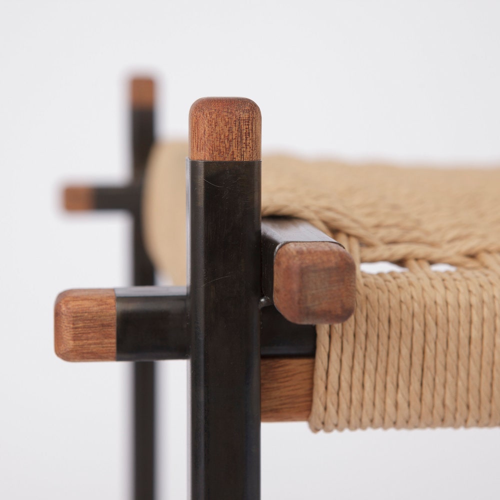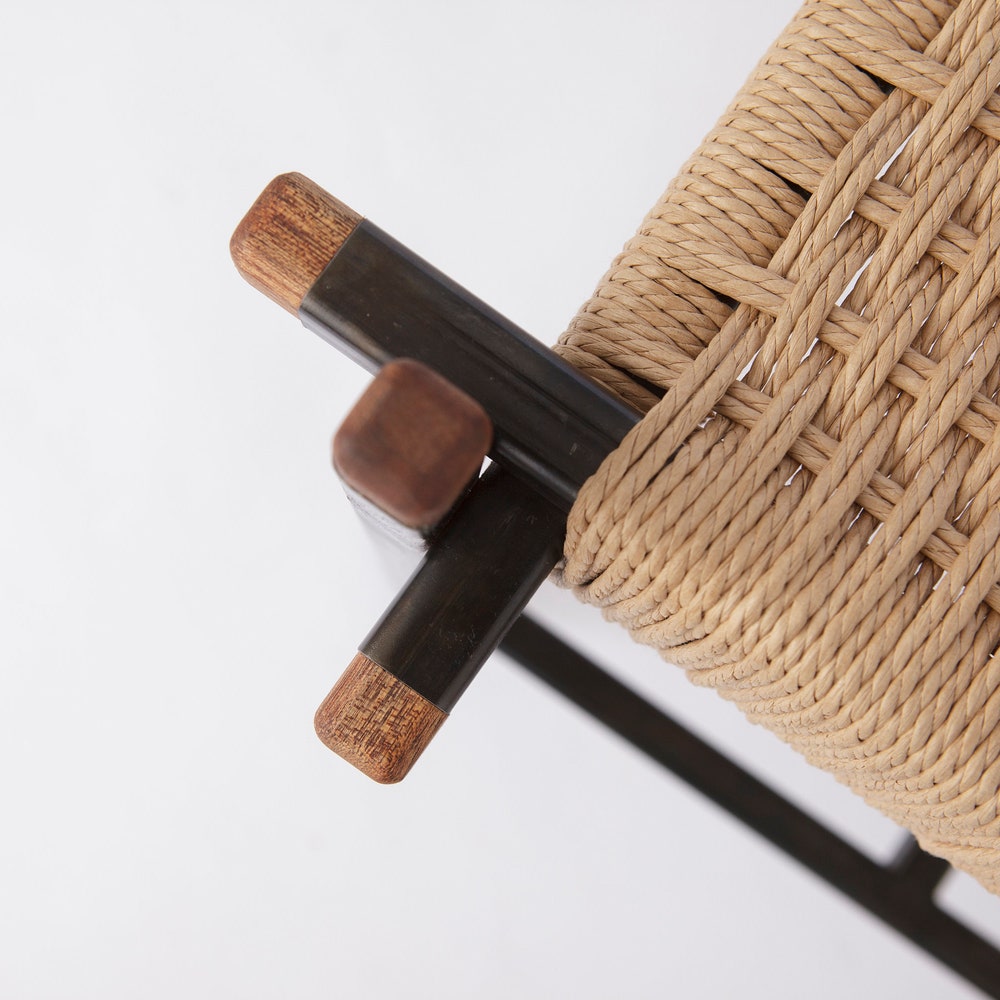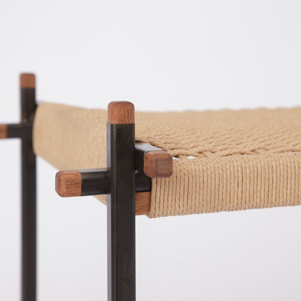 The seat consists of a continuous Danish paper cord braided around L-shaped nails using a traditional craftsmanship method. For this purpose, mahogany strips are mounted below the steel frame. The frame of the bench is welded by hand, then blued (blackened) and oiled.