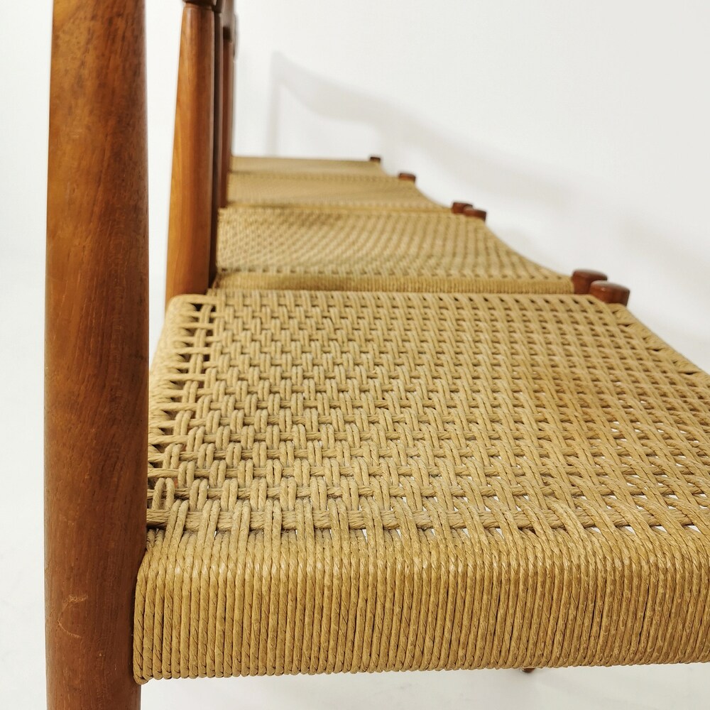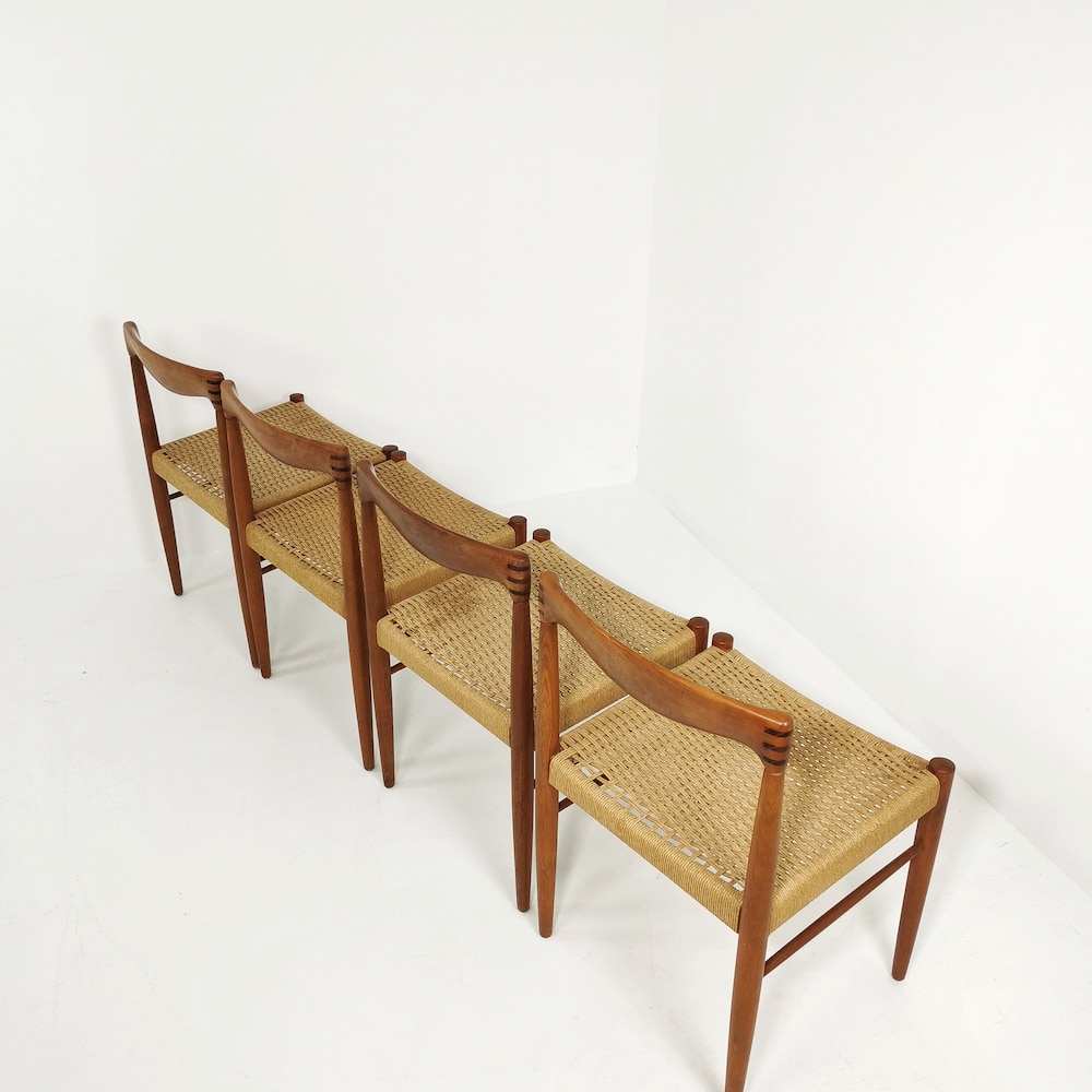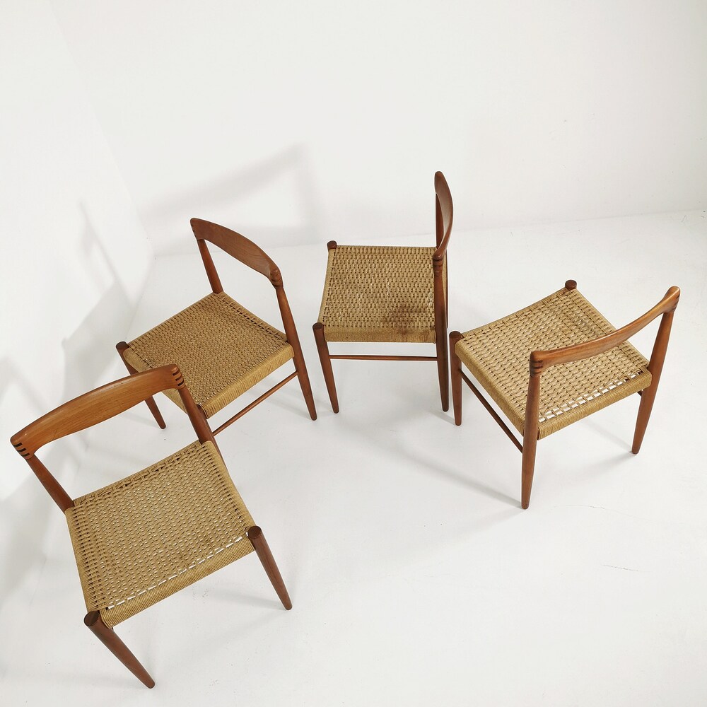 The chair frames are made from solid teak and and are in great condition. 2 of the seats have some minor wears, seen in the pictures. The cord is ordinal, can however be changed.