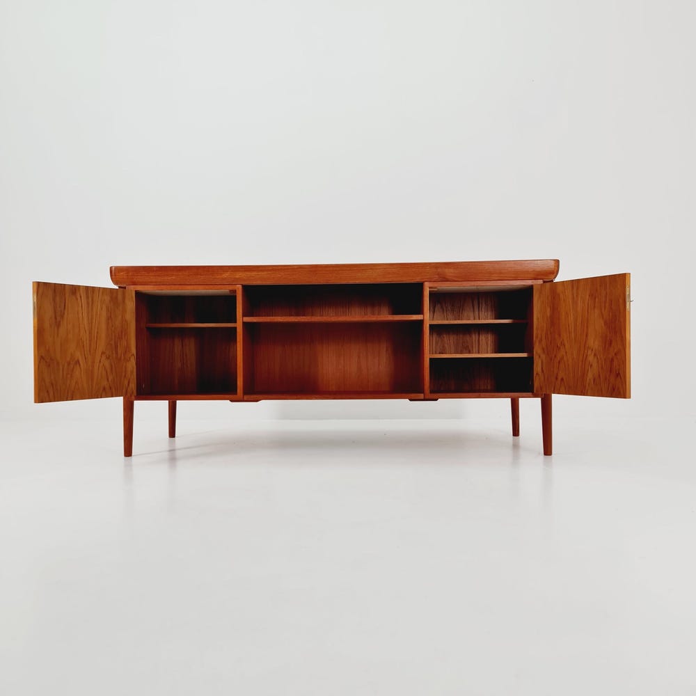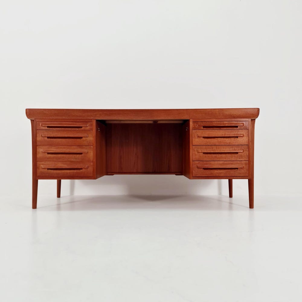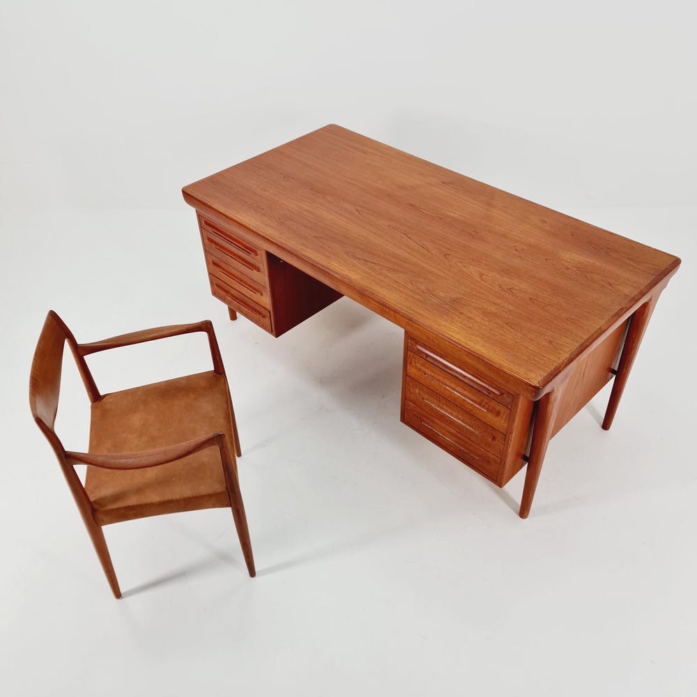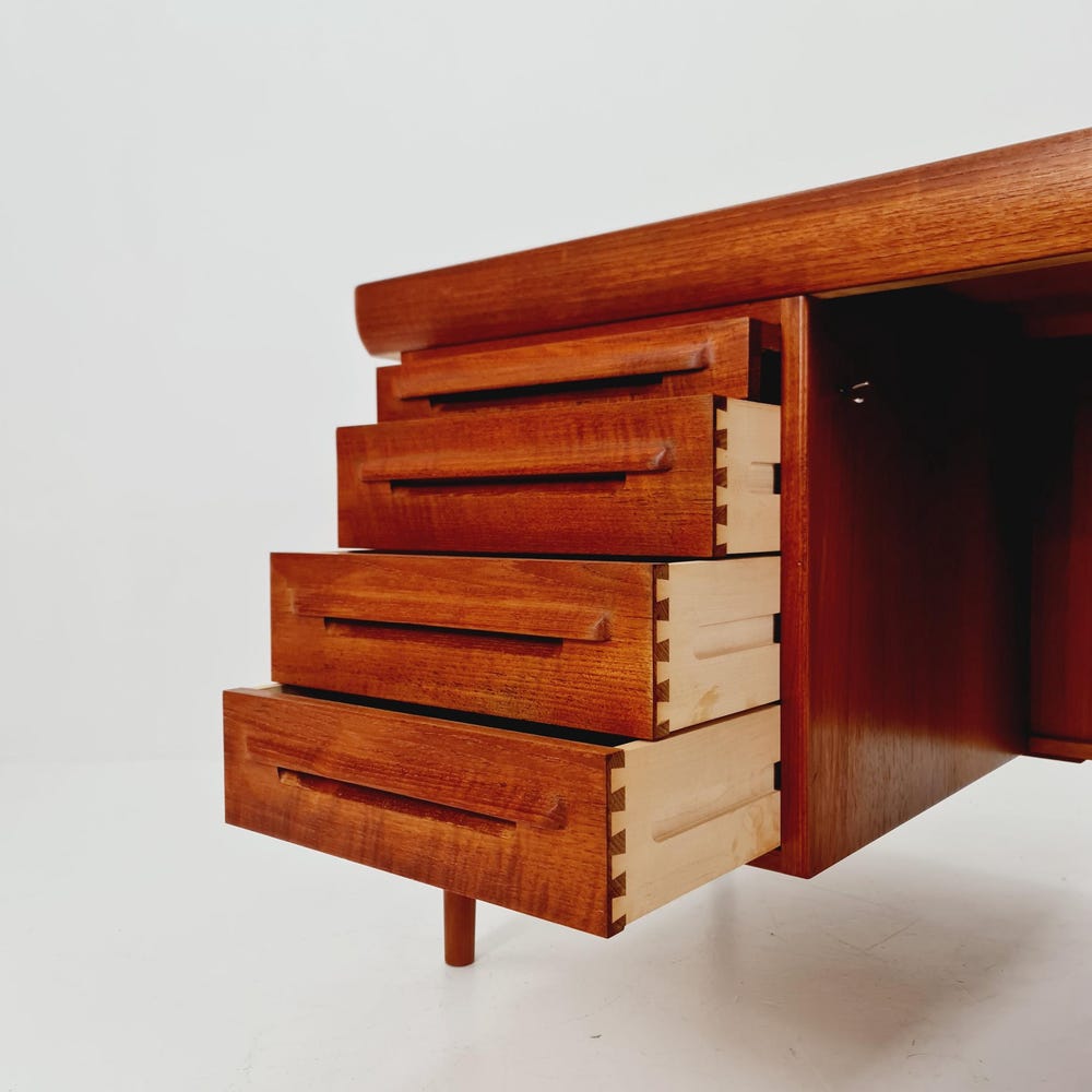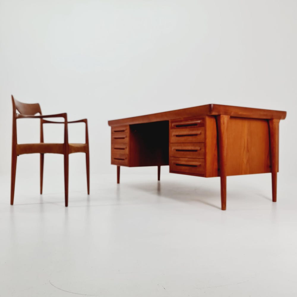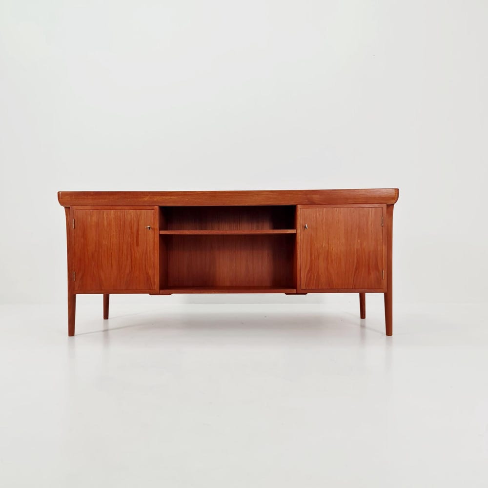 Danish teak desk model Executive Desk by Ib Kofod Larsen, 1960sDesign year: 1960s Designer: Ib Kofod Larsen Dimensions:85 D x 165 W x 73 H cmbetween the drawers (chair place): 67 cm It is in good vintage condition, however, as with all vintage items some minor wear marks should be expected. Please inquiry for prices […]