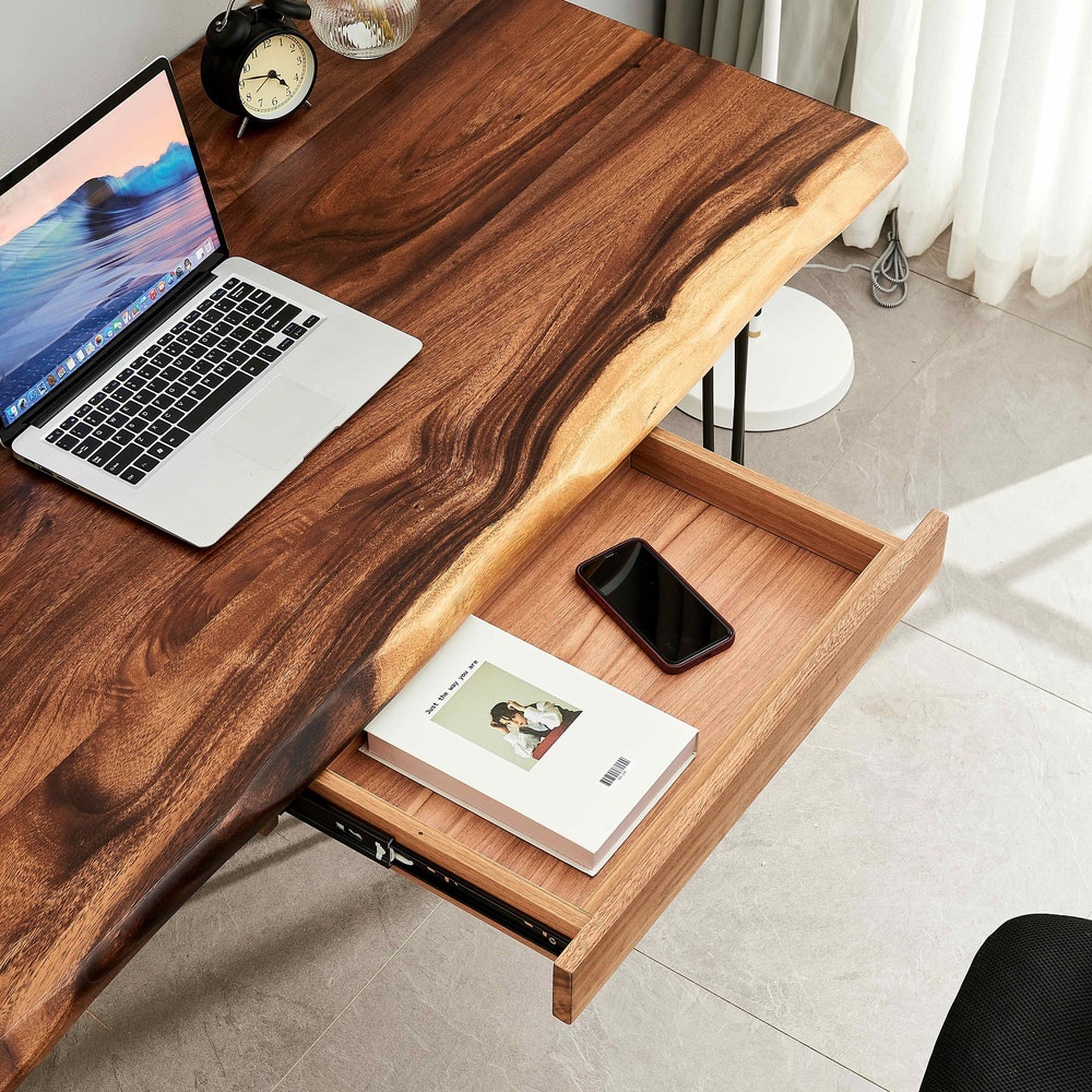 One-of-a-kind, our live edge office desk looks stunning in any room. Its modern-industrial design is made to last with premium South American walnut (Samanea saman) and a zero VOC (non-toxic) topcoat with the hardness and durability of a traditional lacquer or polyurethane. Our eco-friendly and sustainable walnut comes from managed forests that are in compliance with environmental law.