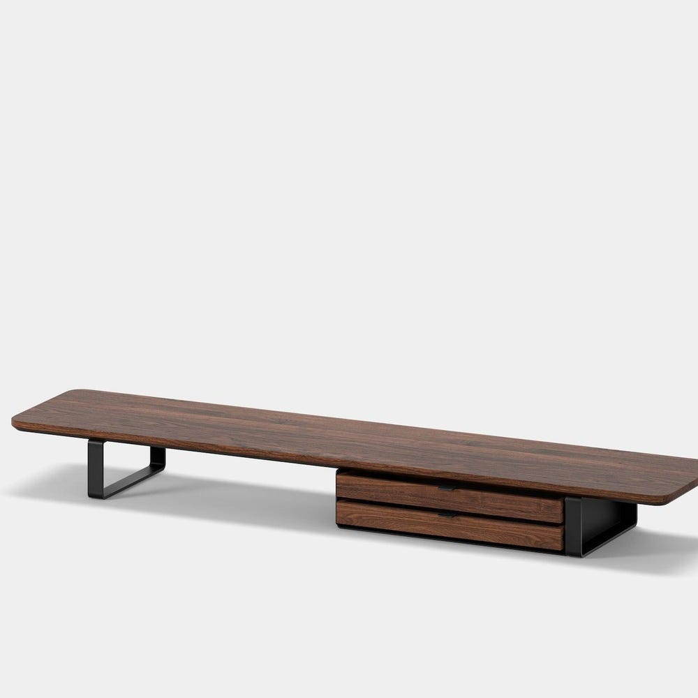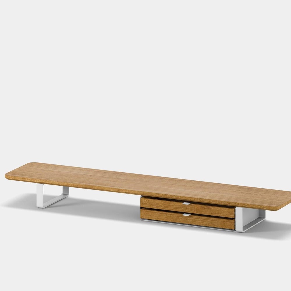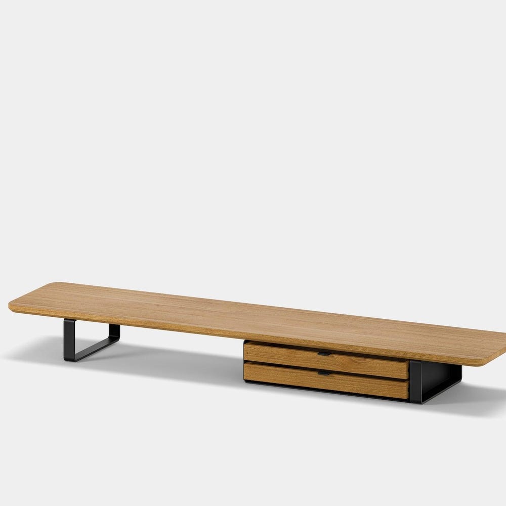 The Desk Shelf is designed to hold two monitors or one ultrawide screen, with an elevated construction that frees up space underneath for storing essentials like a keyboard, headphones, or notebooks.