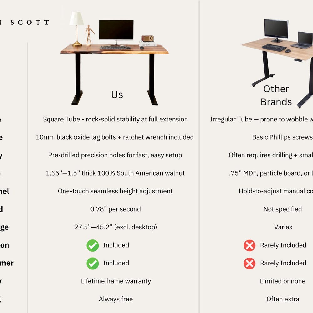 Anyone who’s serious about working at their desk knows the great value of a standing desk. Meticulously designed by Keelan Scott, our new sit-stand desk is engineered to fit our proprietary universal bracket. With our 100% solid walnut top, custom motorized frame, and a price that can’t be found anywhere else, this standing desk is hard to beat.