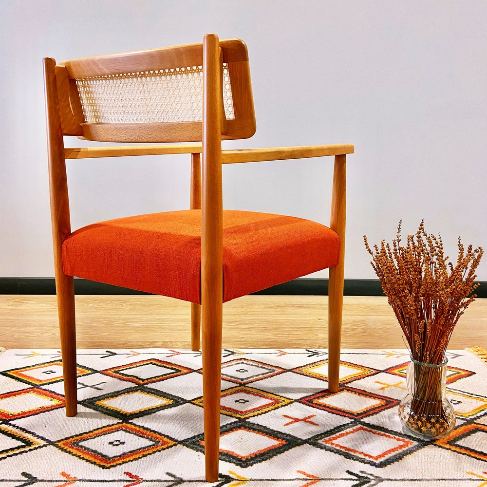 Unique design, stylish mid-century modern chair with natural rattan detail on the back, comfortable seat and wooden arms. The wooden dining chairs are handcrafted from high quality solid beech wood. This Danish chair can be used as a dining chair, desk chair and side chair. You can customize the finish (or paint) and seat fabric of this wooden dining chair, which is 100% handmade from solid beech wood, by choosing from the catalogs in the photos. Just write the code you chose for the fabric on the personalization bar.