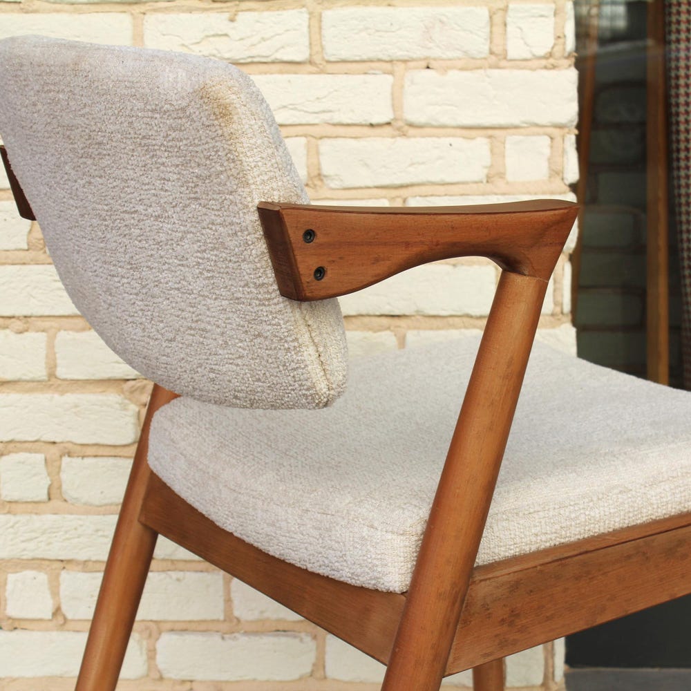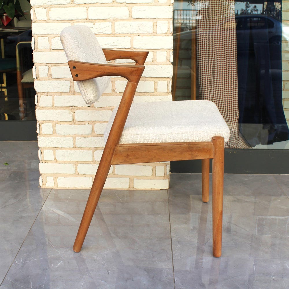 Comfortable and ergonomic dining chair made of light beige soft fabric. Upholstery will be made with care and handcrafted fabric colors.