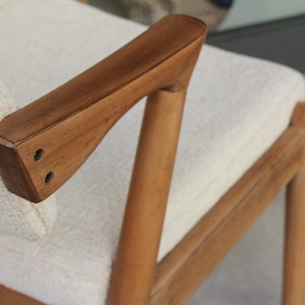 Comfortable and ergonomic dining chair made of light beige soft fabric. Upholstery will be made with care and handcrafted fabric colors.