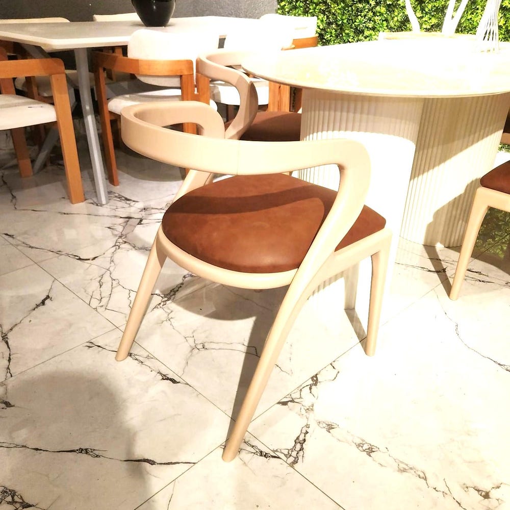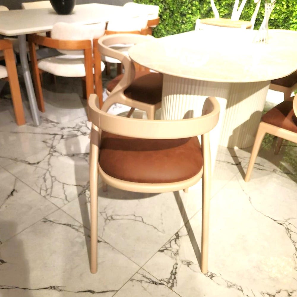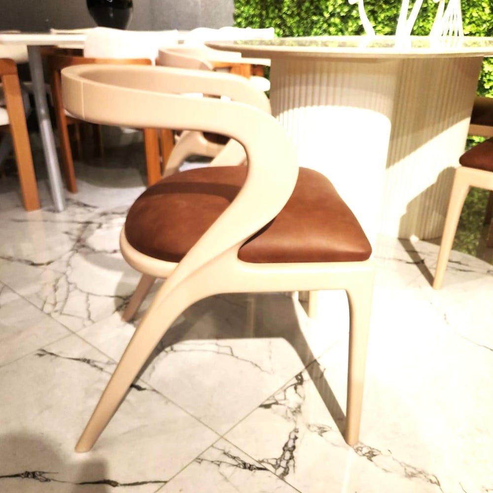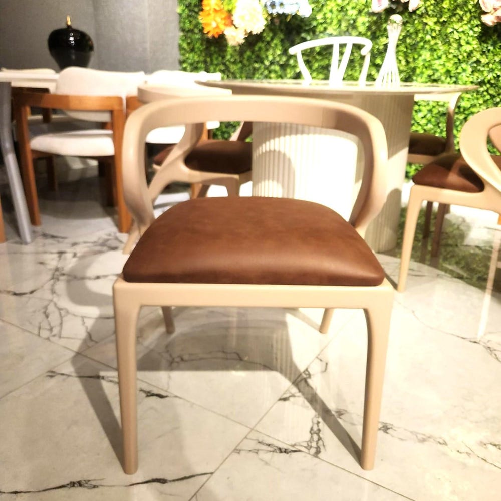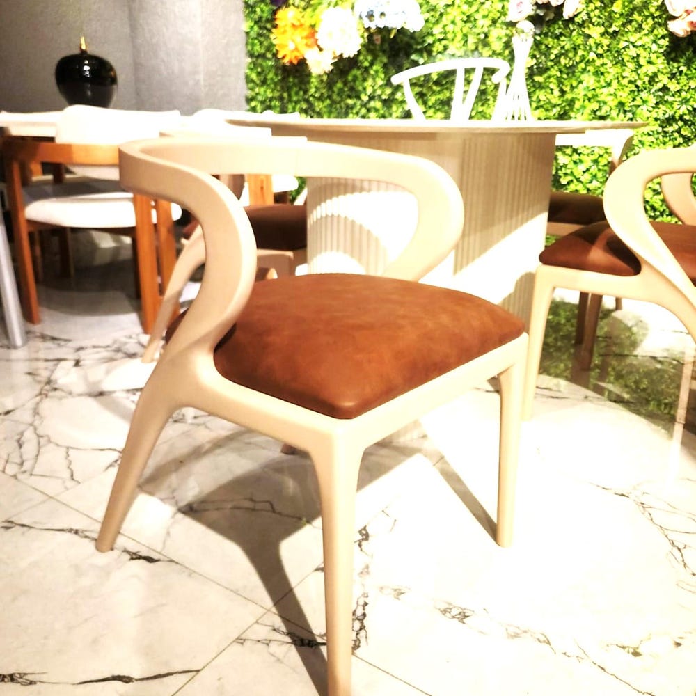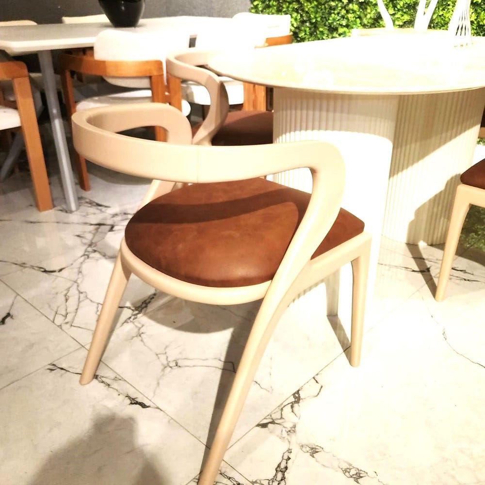 Comfortable and ergonomic dining chair made of light beige soft fabric. Upholstery will be made with care and handcrafted fabric colors.