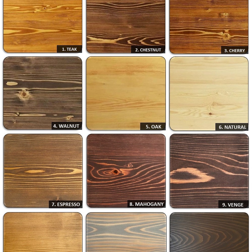 | Primary color | 1.Teak, 2.Chestnut, 3.Cherry, 4.Walnut, 5.Oak, 6.Natural, 7.Espresso, 8.Mahogany, 9.Wenge, 10.Honey, 11.Grey, 12.Weathered Black |