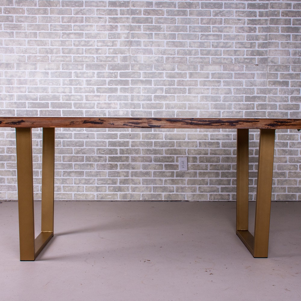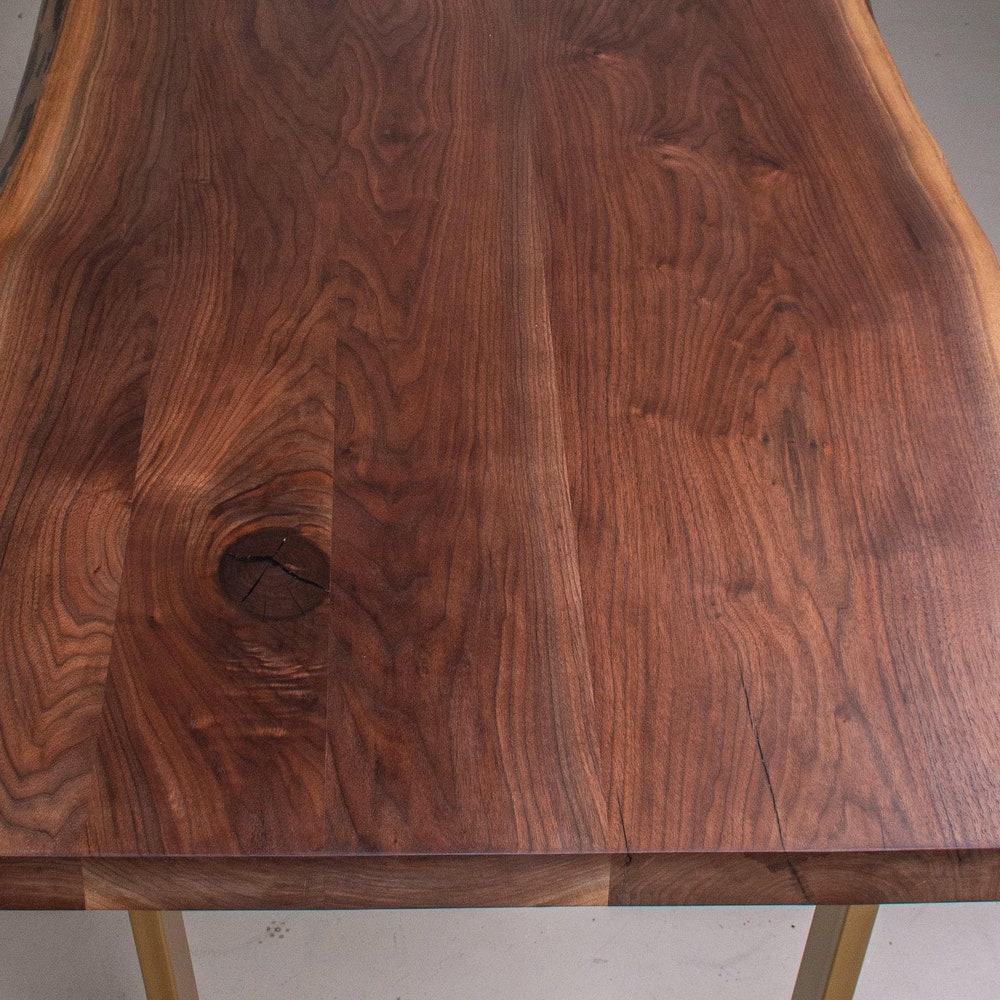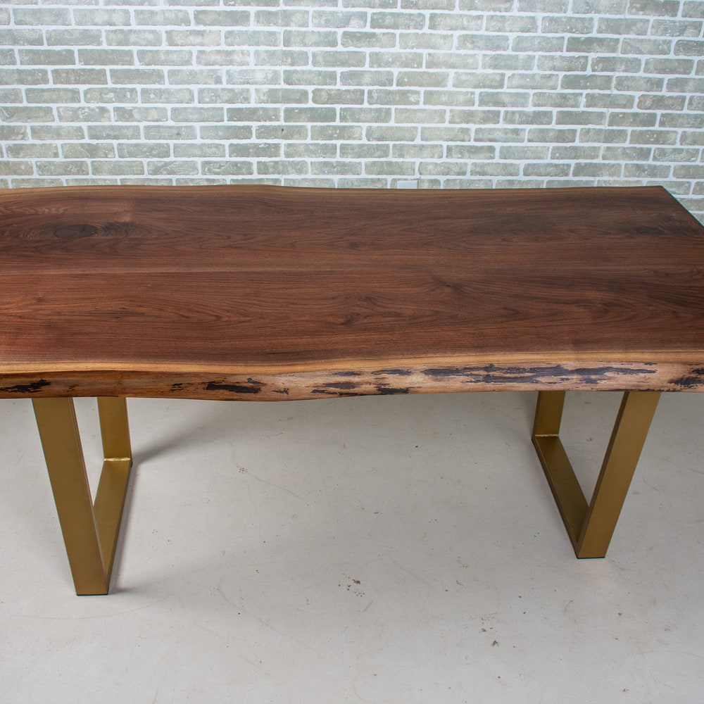 Celebrate the rich colors of this dining table made of live edge walnut. The gold colored legs highlight the beautiful natural tones of the walnut wood, creating a stunning centerpiece for your dining room. We build every table to order so there are many ways to make this table perfect for you.