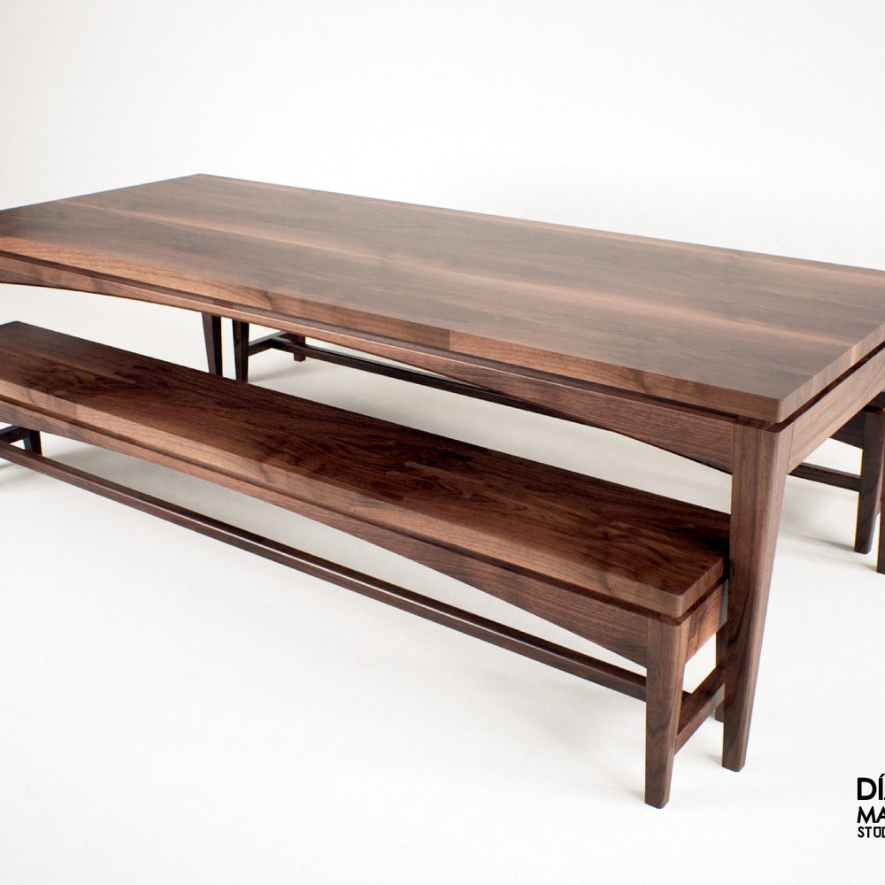 Dinning room set in american walnut, mid century dining table and bench, farm house table and benches, distressed furniture