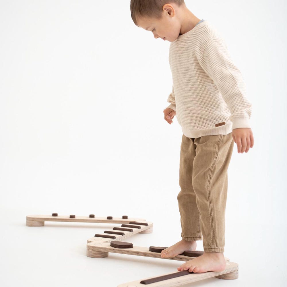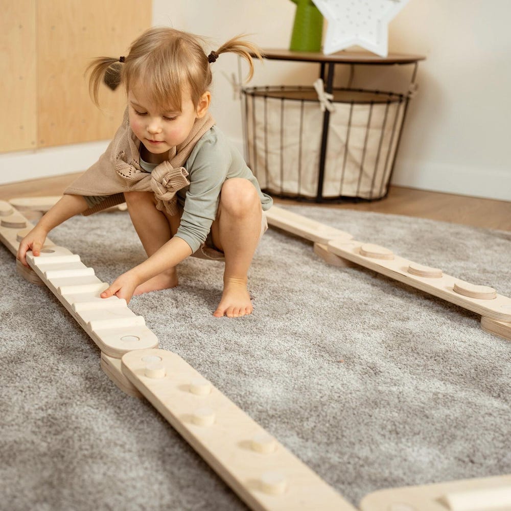 Balance beam set from 8 beams. HappyMoon team offers the first double-sided balance beam in the world. It is an open-ended wooden toy that develops sense of balance and agility, fine and gross motor skills, strengthens muscles, and is a good leg trainer, which helps prevent flat feet and toe walking.