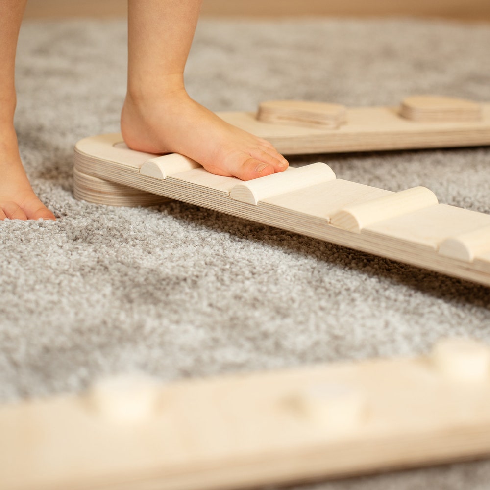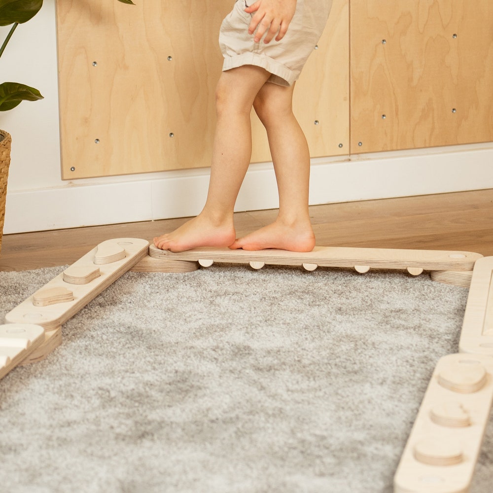 Natural balance beam set from 4, 6 or 8 beams helps to learn different shapes, learn how to balance body and develop gross motor skills. Different shaped obstacles improves feet sensory stimulation and are recommended to gain barefoot sensations.