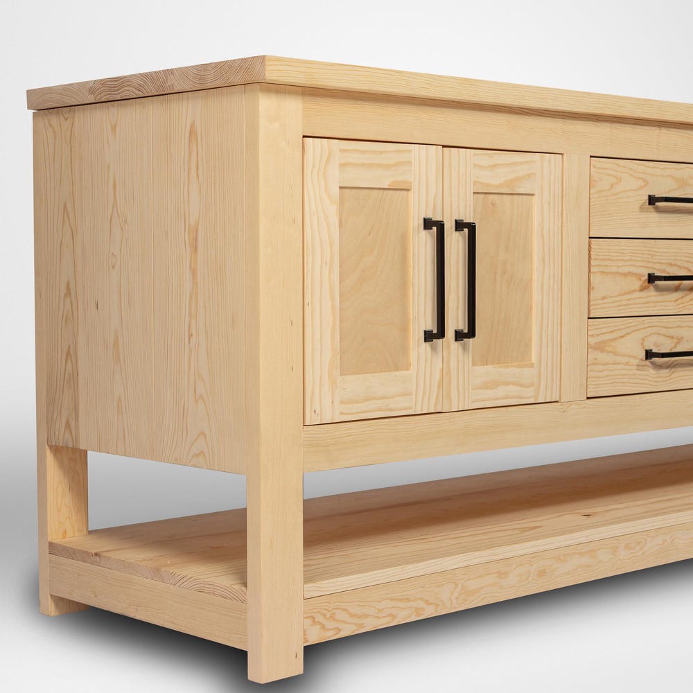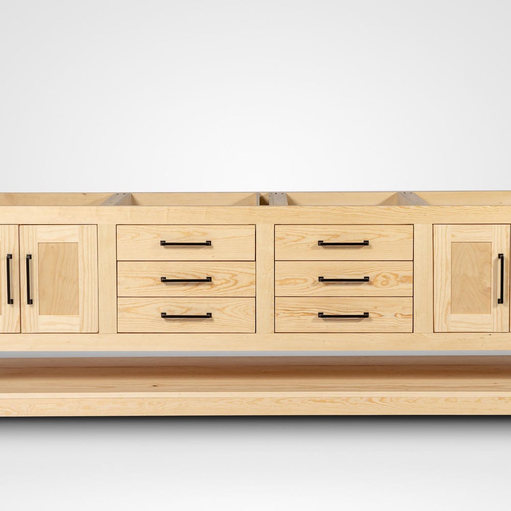 Enhance your bathroom space with the exceptional craftsmanship of our handmade solid American pine wood bathroom vanity. Meticulously created, each piece is thoughtfully sanded, stained, and sealed to perfection, ensuring both durability and a stunning finish. Enjoy the seamless functionality of soft-close hinges and slides, adding a touch of luxury to every door and drawer.