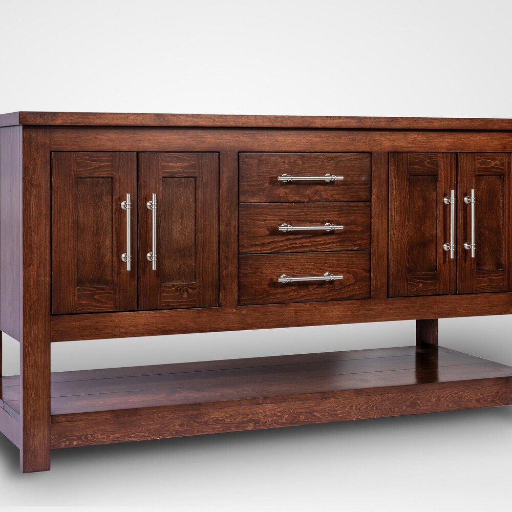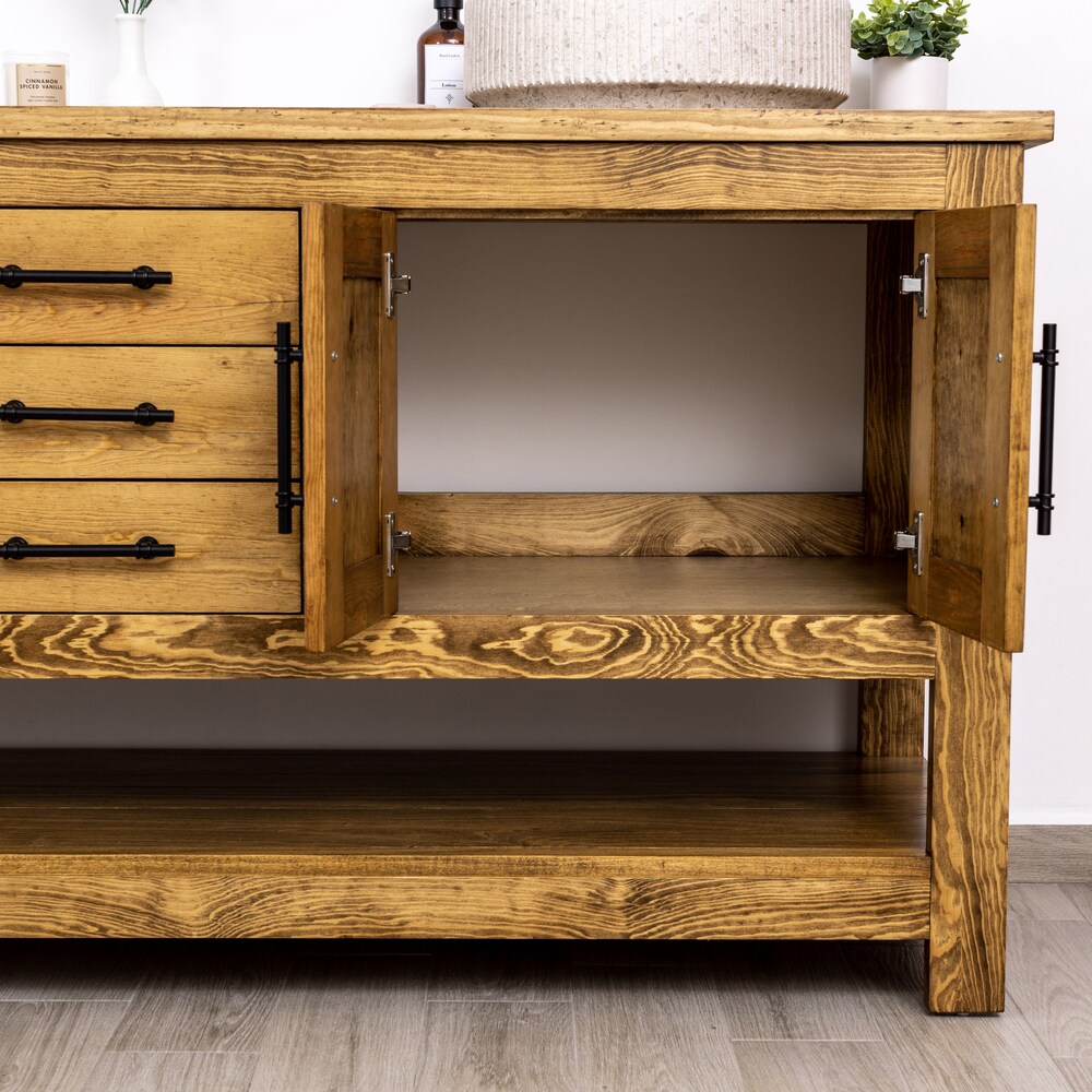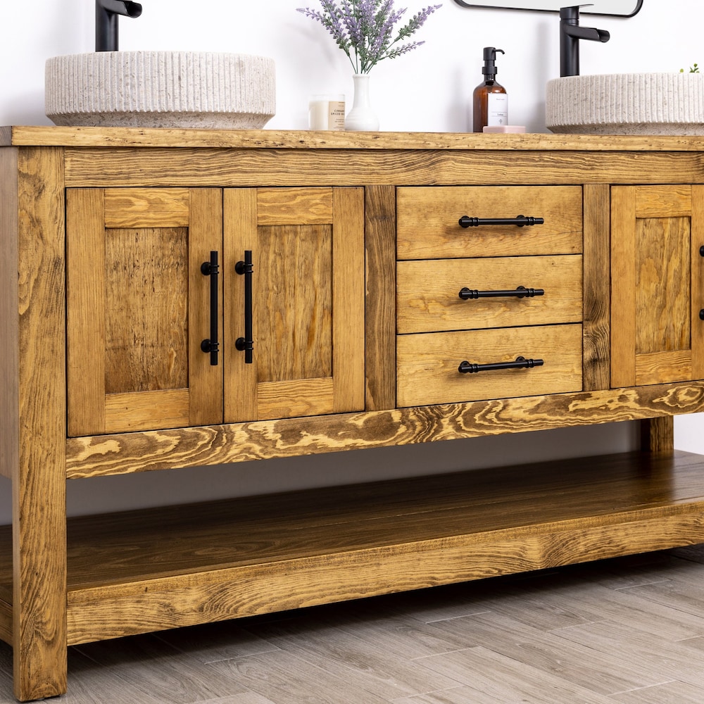 Enhance your bathroom space with the exceptional craftsmanship of our handmade solid American pine wood bathroom vanity. Meticulously created, each piece is thoughtfully sanded, stained, and sealed to perfection, ensuring both durability and a stunning finish. Enjoy the seamless functionality of soft-close hinges and slides, adding a touch of luxury to every door and drawer.