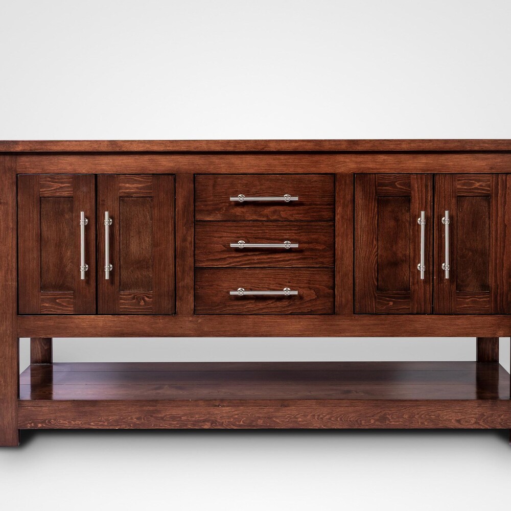 The product listing highlights our 72-inch double sink vanity in Early American wood stain. It is versatile, allowing for either a vessel sink or undermount sink installation.
