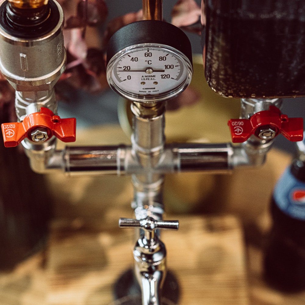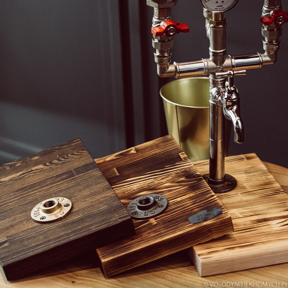 The product is made of plumbing things, which create an interesting vintage industrial look. The dispenser system is built onto a board of wood which is hand stained and varnished.