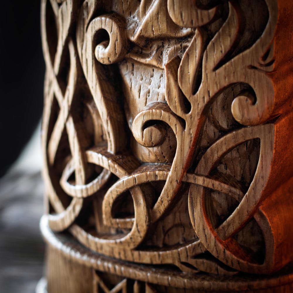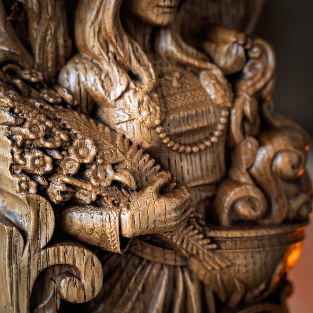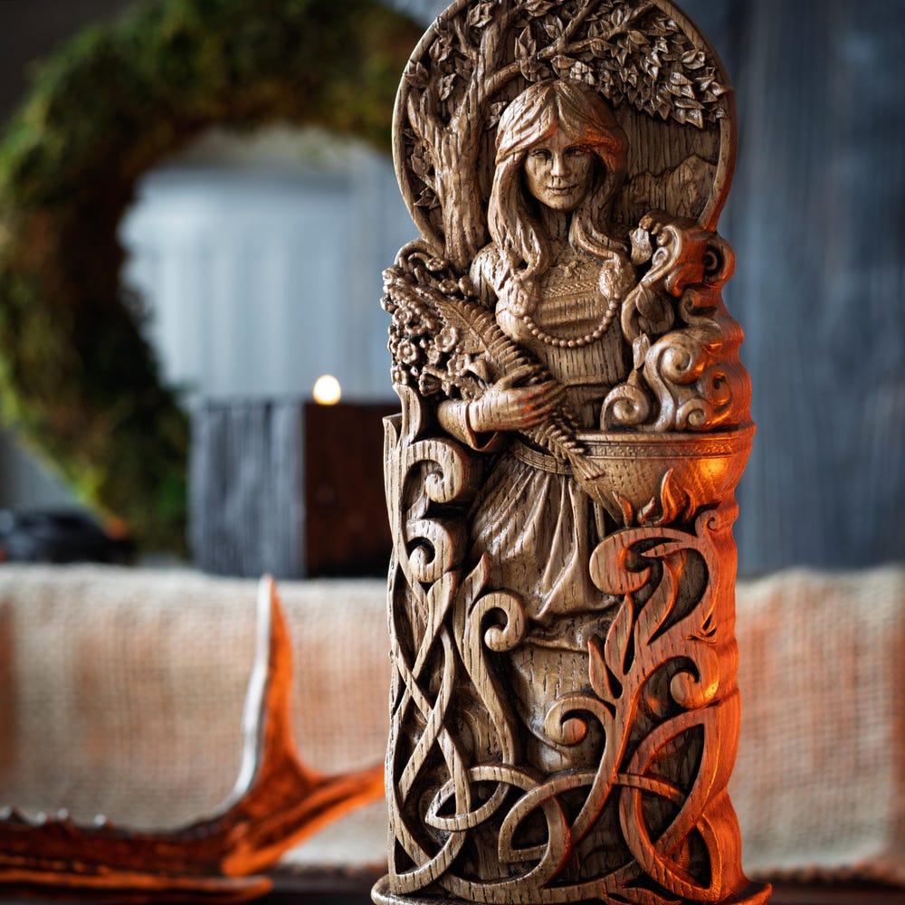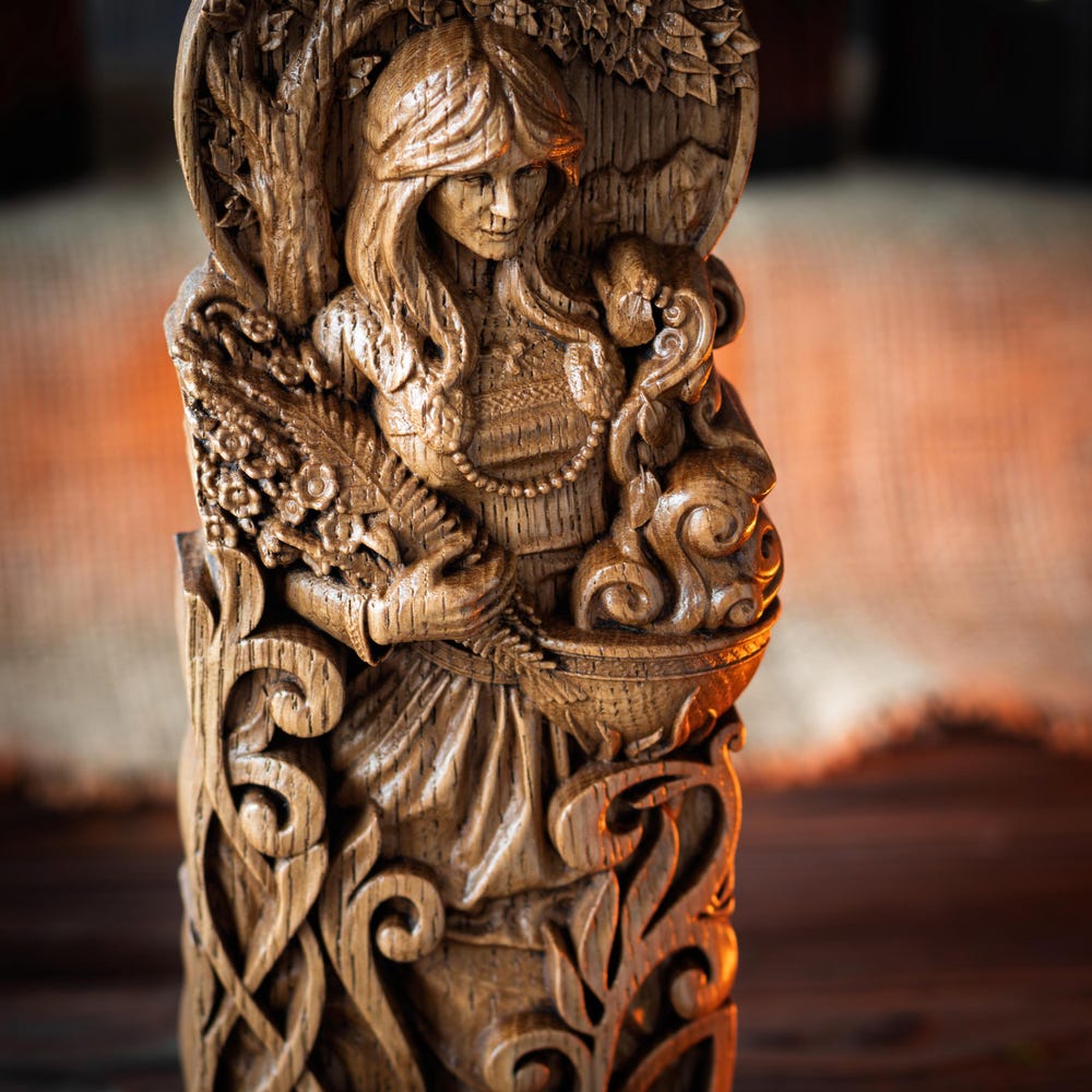 Bragi statue, norse gods, wood carving altar heathen asatru viking god and goddes sculpture wooden scandinavian pantheon