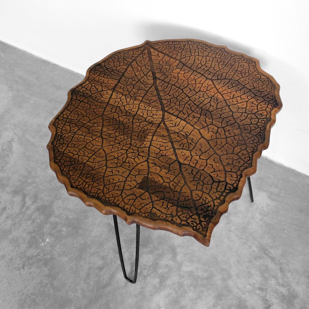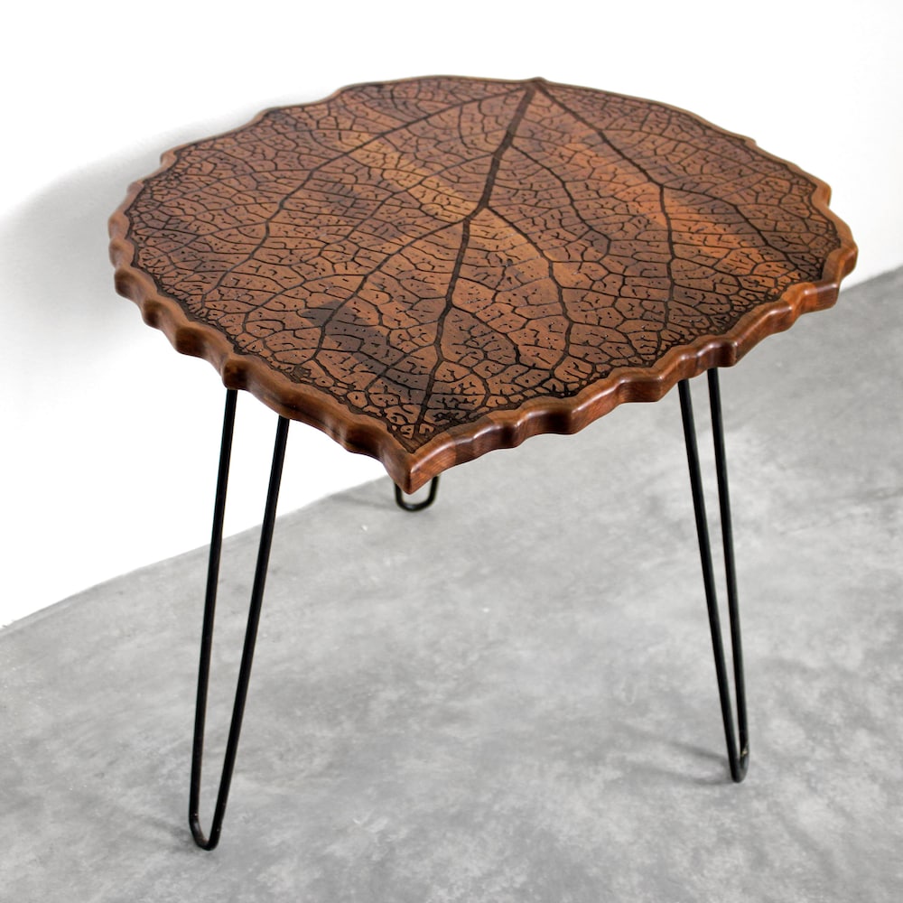 Engraved Walnut Teak Hardwood LEAF with Metal Hairpin Legs – End / Side Table or Night Stand – Modern Mid Century Boho Furniture Eames