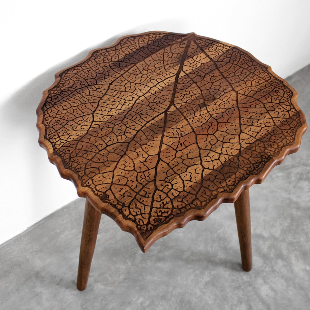 Engraved Walnut Teak Hardwood LEAF with Turned Wood Legs – End / Side Table or Night Stand – Modern Mid Century Boho Furniture Design Eames