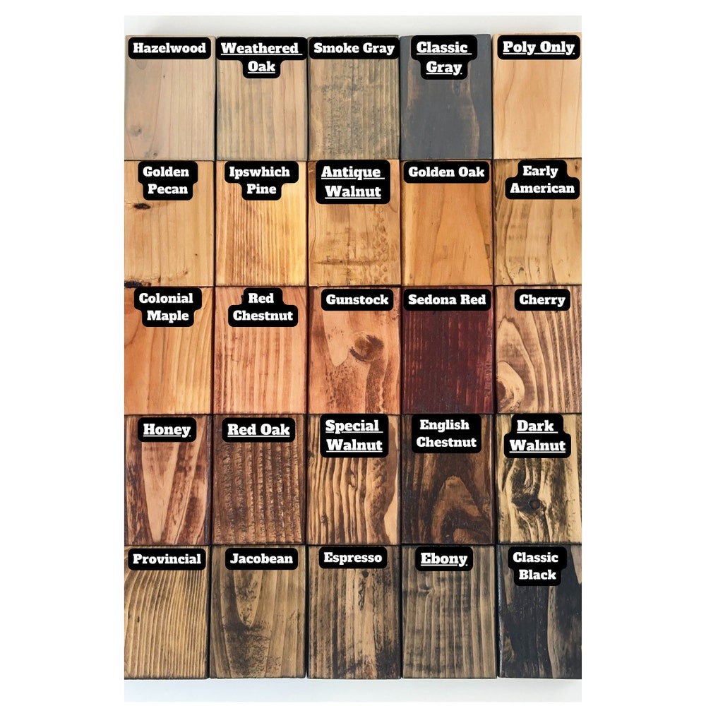 | Primary color | Natural poly only, Antique Walnut, Special Walnut, Dark Walnut, Ebony, Honey, Red Oak, Weathered Oak, English Chestnut, add color in notes |