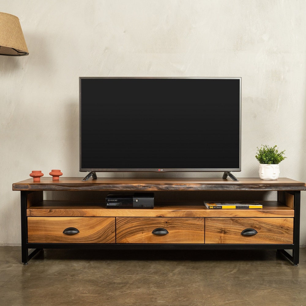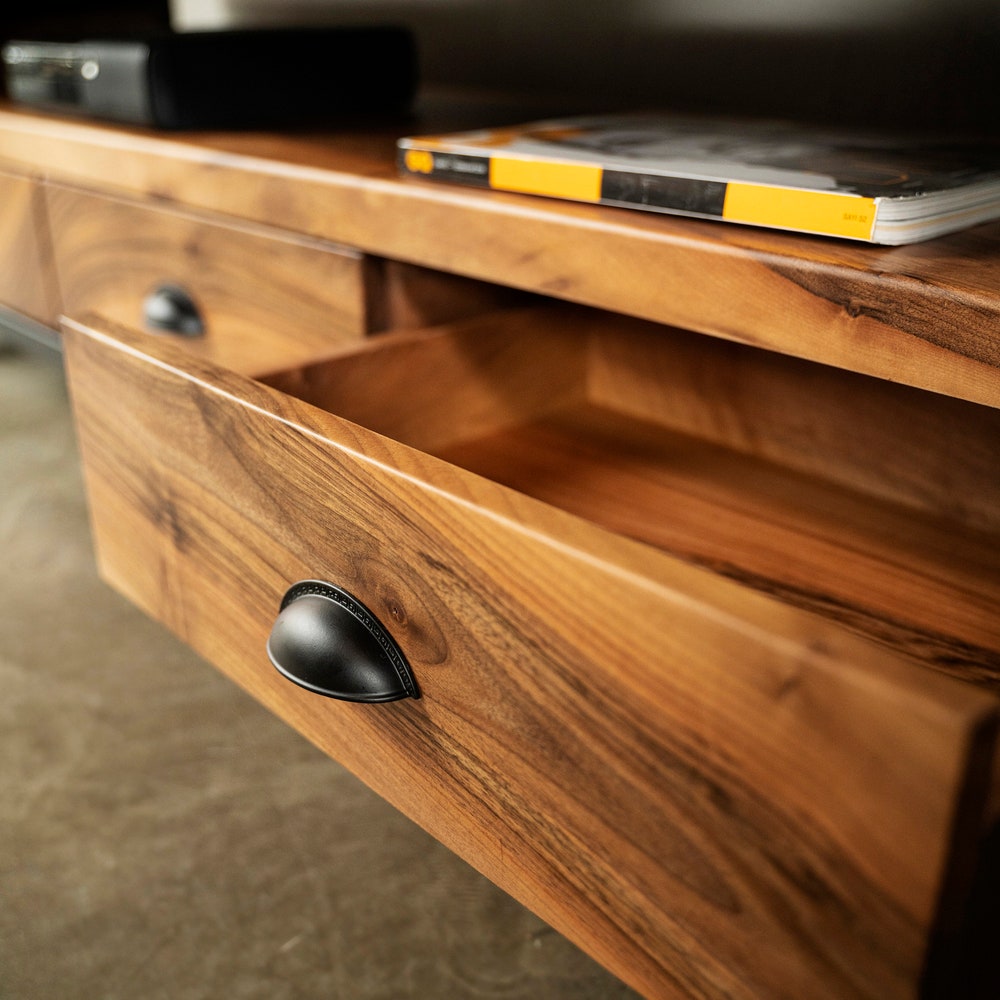 This is a piece of natural luxury Console Tables industrial for Your home. Made completely from solid Walnut. Drawer tv unit is treated with natural Oil to highlight the wood and its pattern. Walnut is considered one of the strongest woods in nature with beautiful light beams in its pattern. The front face of the Farmhouse console is different for each product due to different wood patterns. Perfect for a home setting or as an office piece.A mid-century tv stand ideal for a modern, eclectic and traditional interior. the metal media console enriches interior providing warmth and light with a touch of the modern approach The piece is just as practical as it is beautiful.