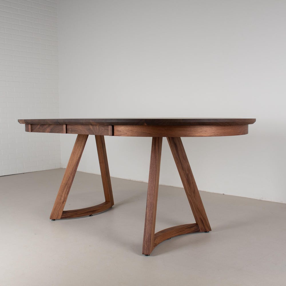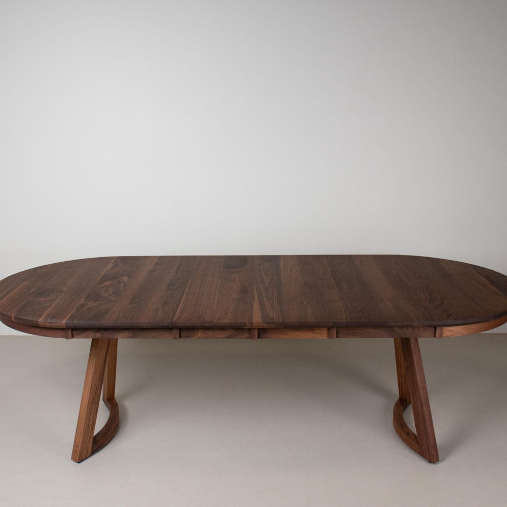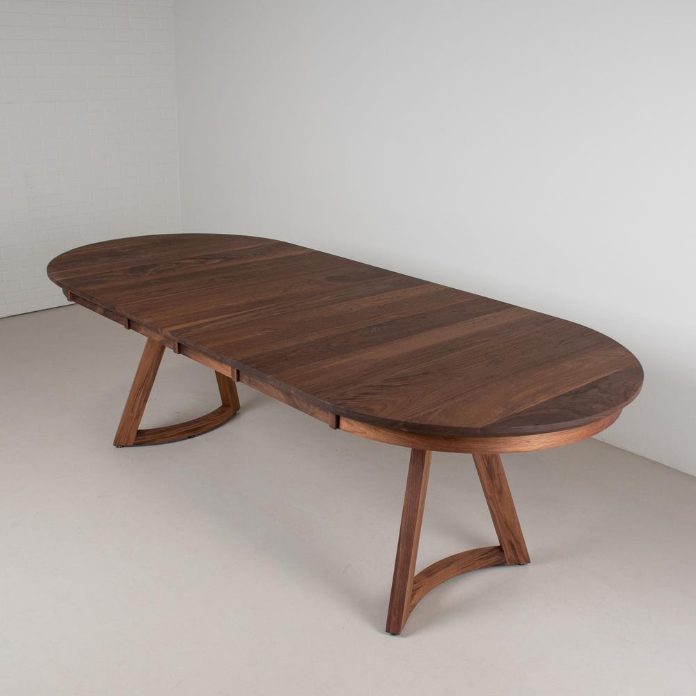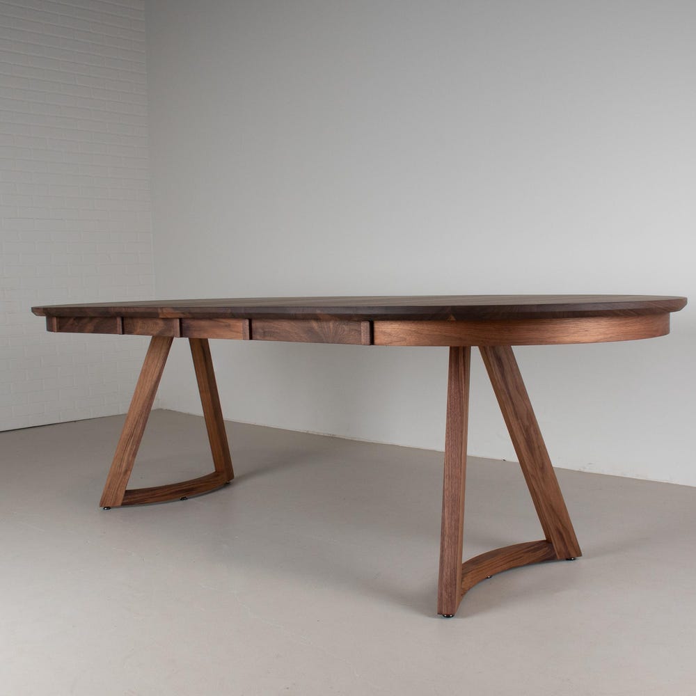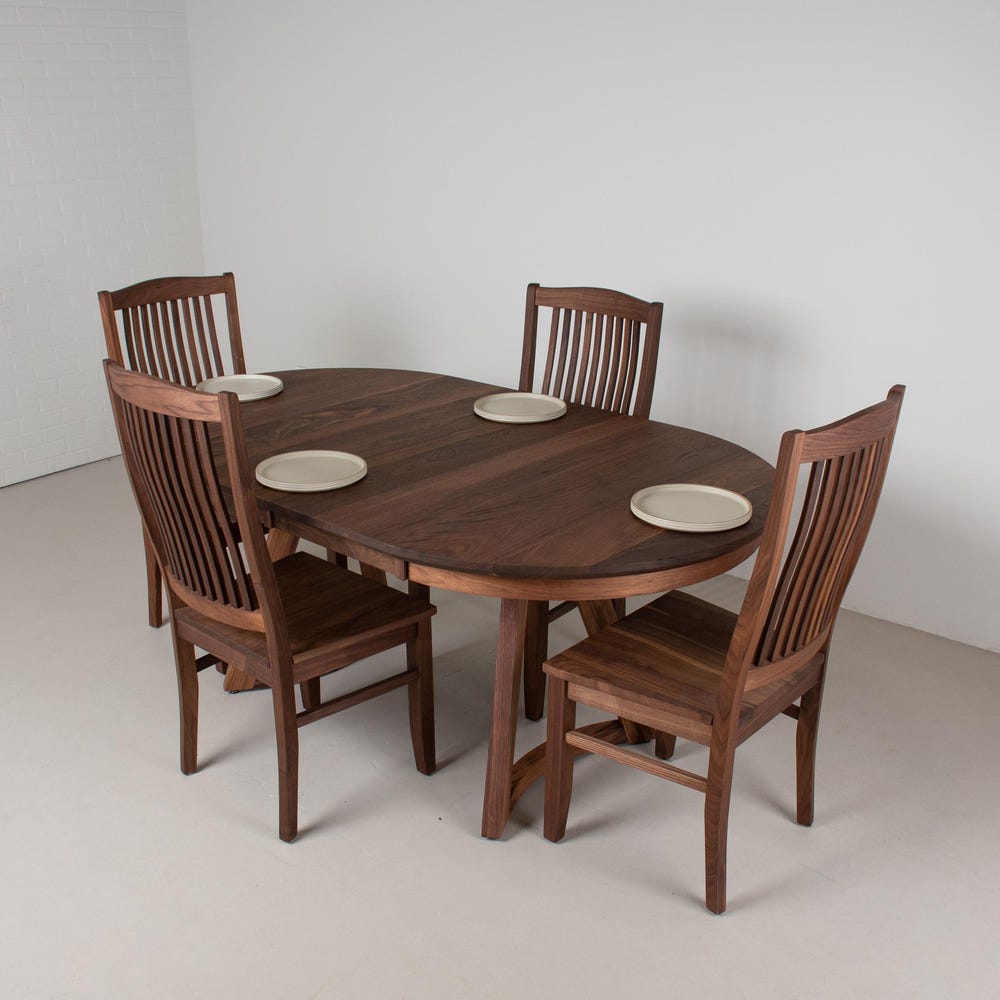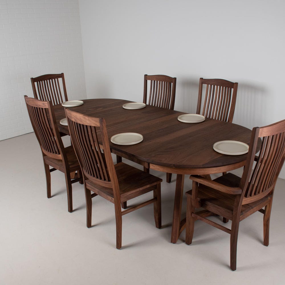This oval extendable dining table was built for a customer and is now in their home. We can build one like it for you that is tailored to your needs. We build every table out of solid hardwoods one at a time. Our design team is happy to help you figure out the details of the table that is best for you.