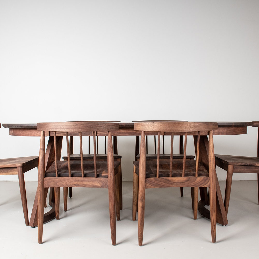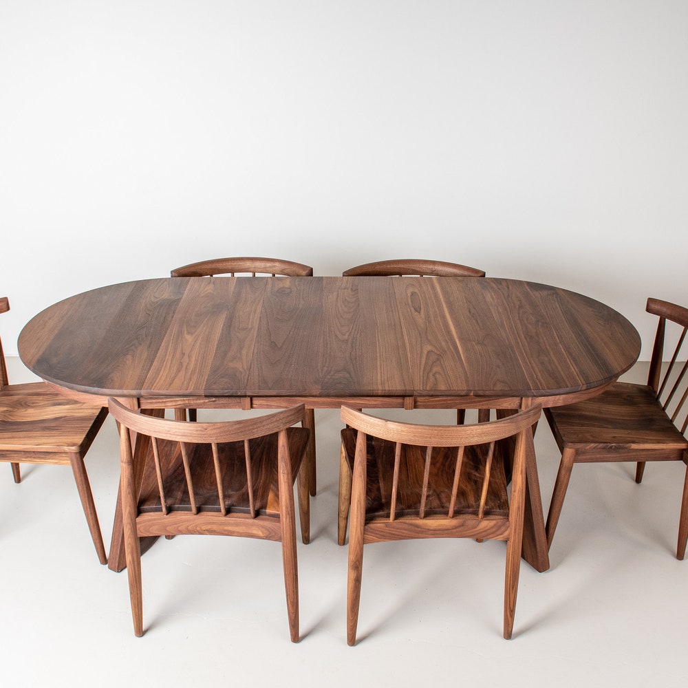 Make every dinner at home memorable with this walnut dining table and chair set. The midcentury styling of the racetrack shape table is complemented by the wishbone style walnut chairs. As a bonus – this table is extendable! We build every table to order so there are many ways to make this table perfect for you.