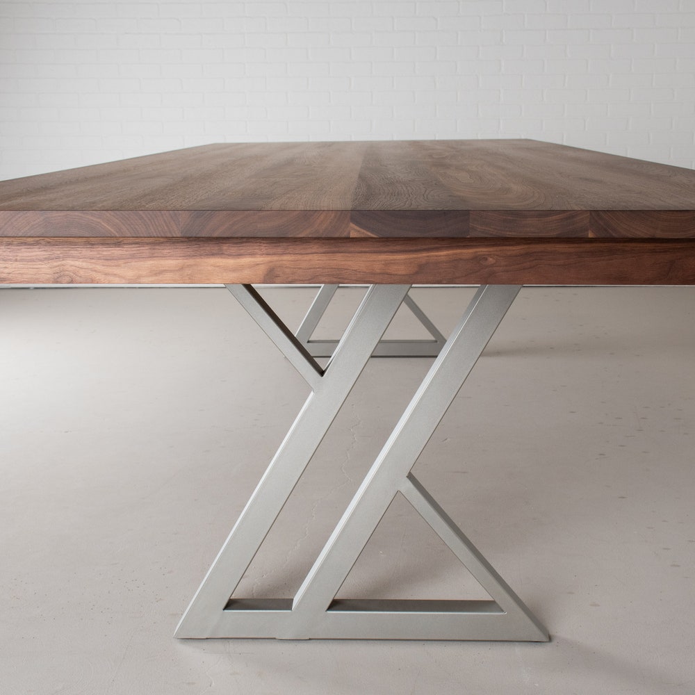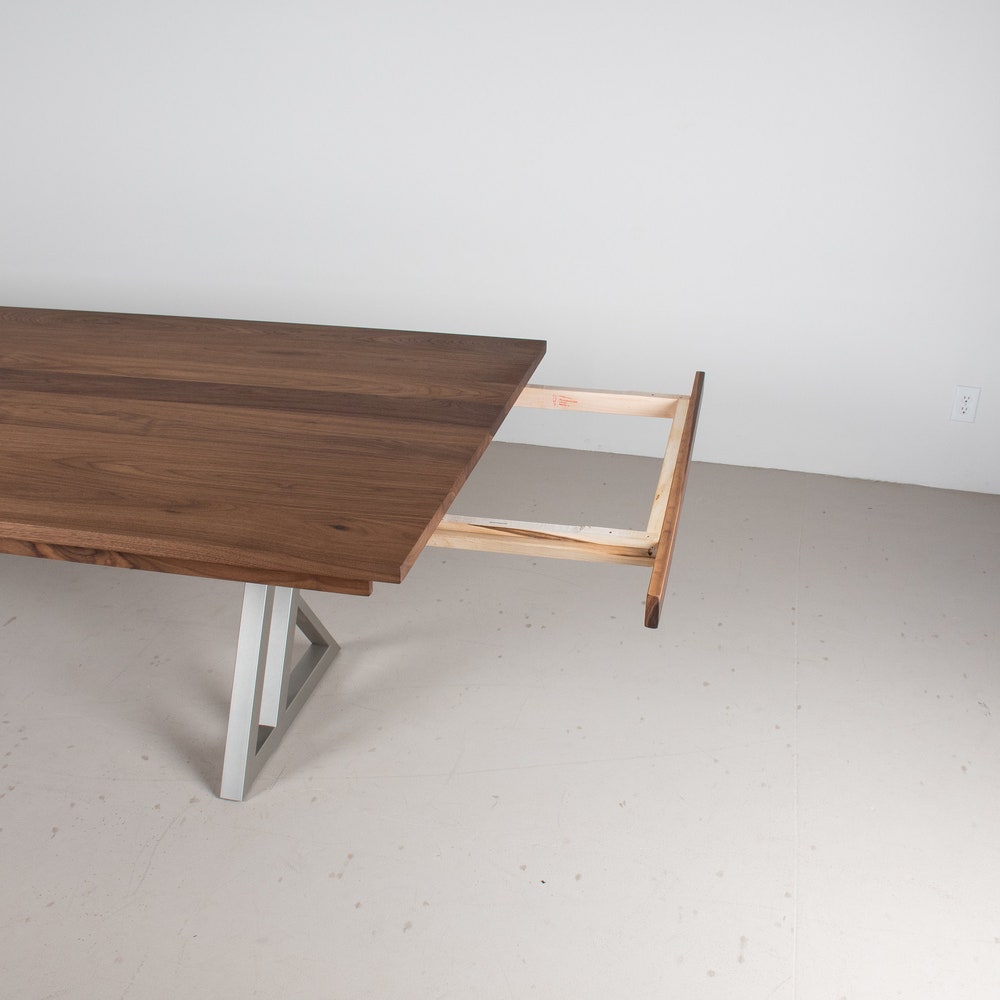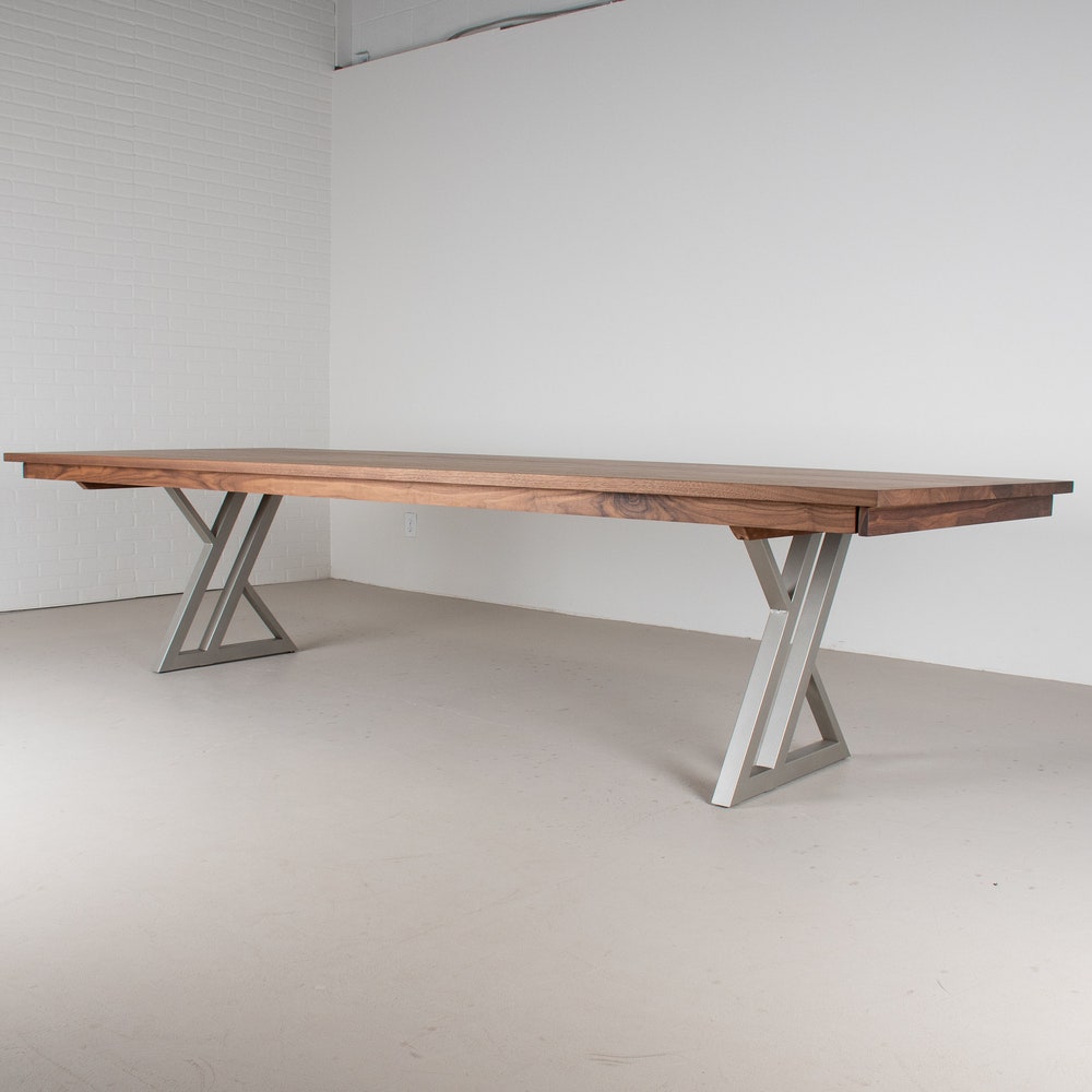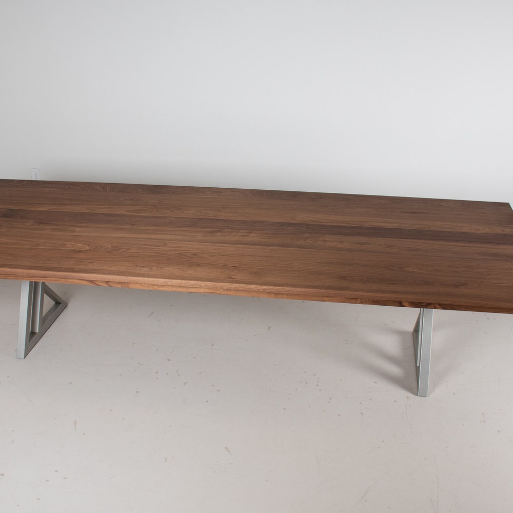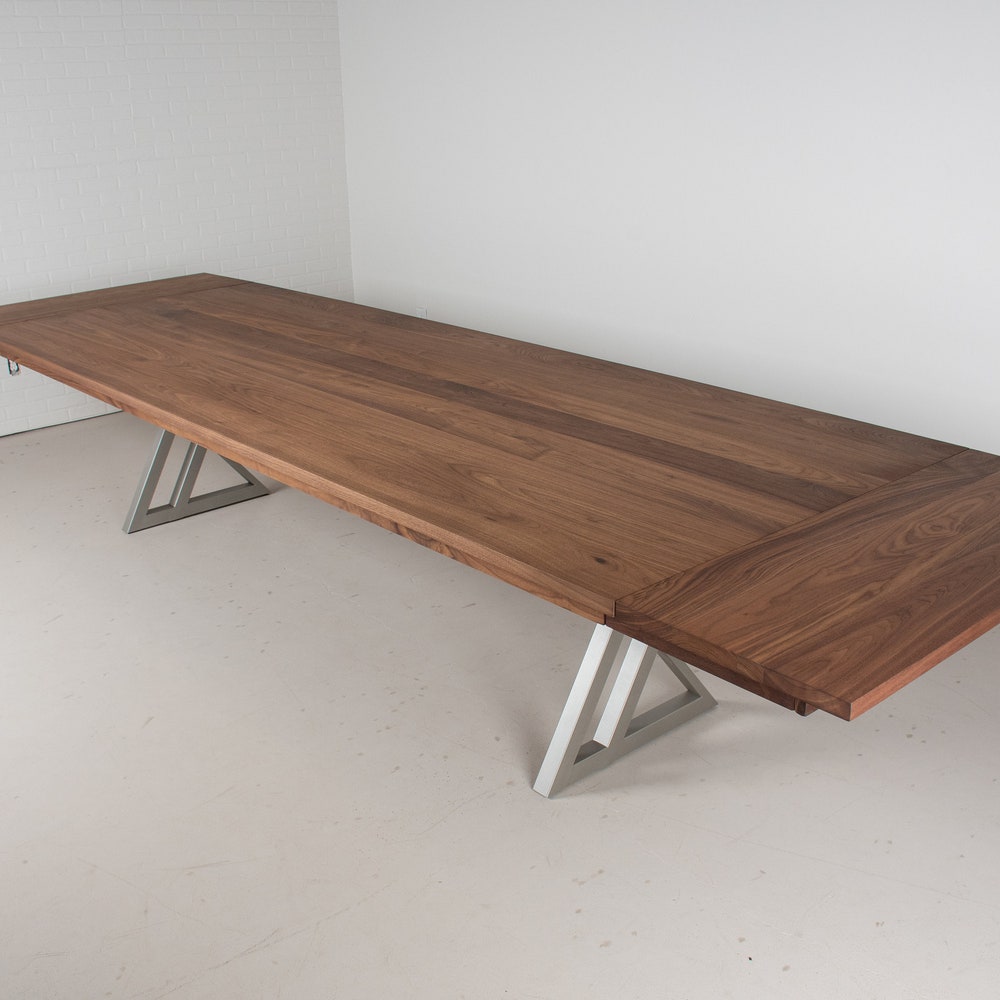 This extra large dining table for a large space, designed for hosting parties. At just over 10 feet long it has good presence and with the leaves in place it is just over 13 feet long, perfect to host a large group for a sit down meal or for a buffet. The richness of the walnut pairs well with the nickel finish on the unique zionz legs and keeps the table from feeling heavy in the space. The seymour edge helps to give this modern table a tailored feel. We build every table to order so there are many ways to make this table perfect for you.