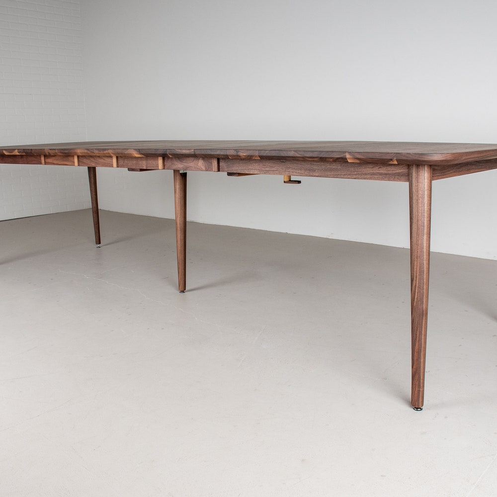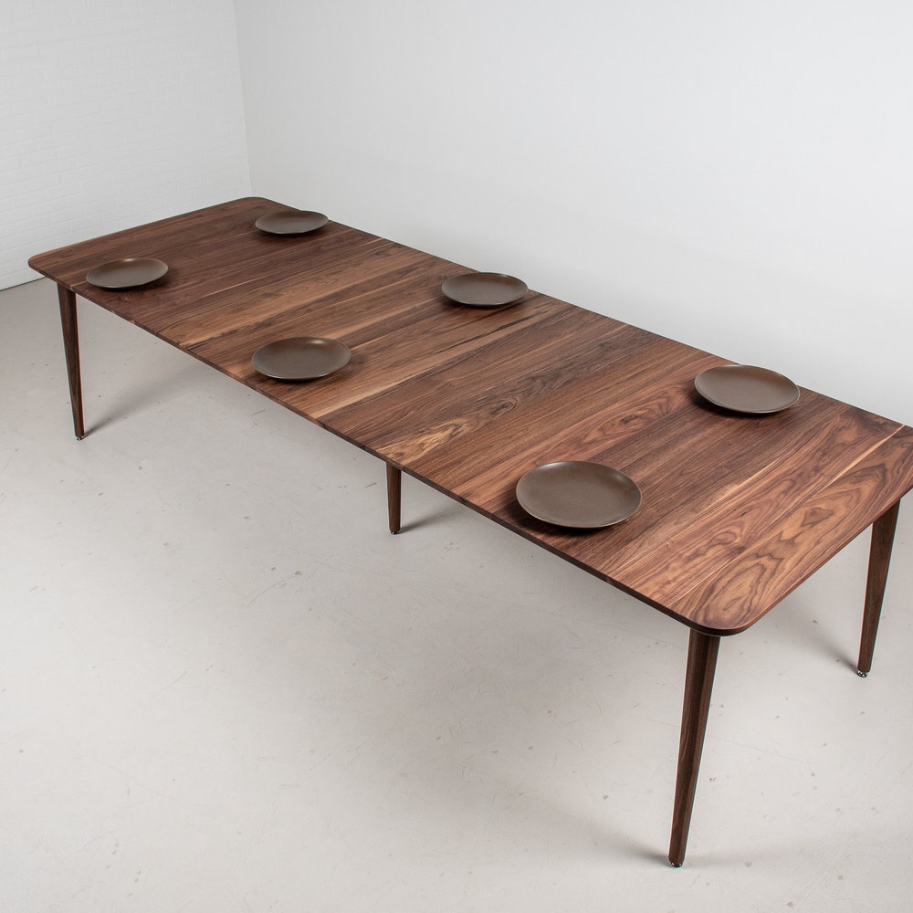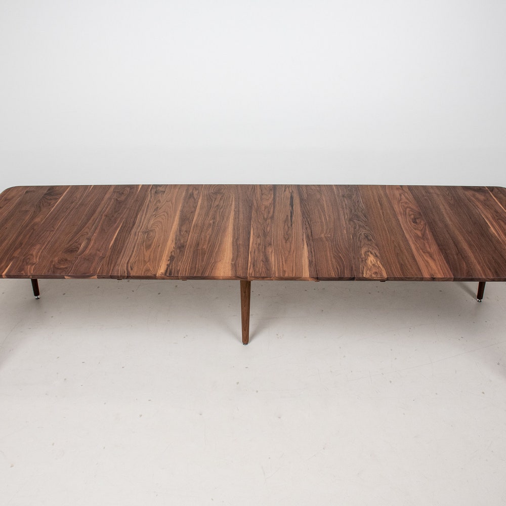This extra long dining table masquerades most days as a perfect sized table for 6. When needed, however, it can be extended with 4 additional leaves to seat 10. The delicate look of this table makes it a great fit for mid century modern spaces. We build every table to order so there are many ways to make this table perfect for you.