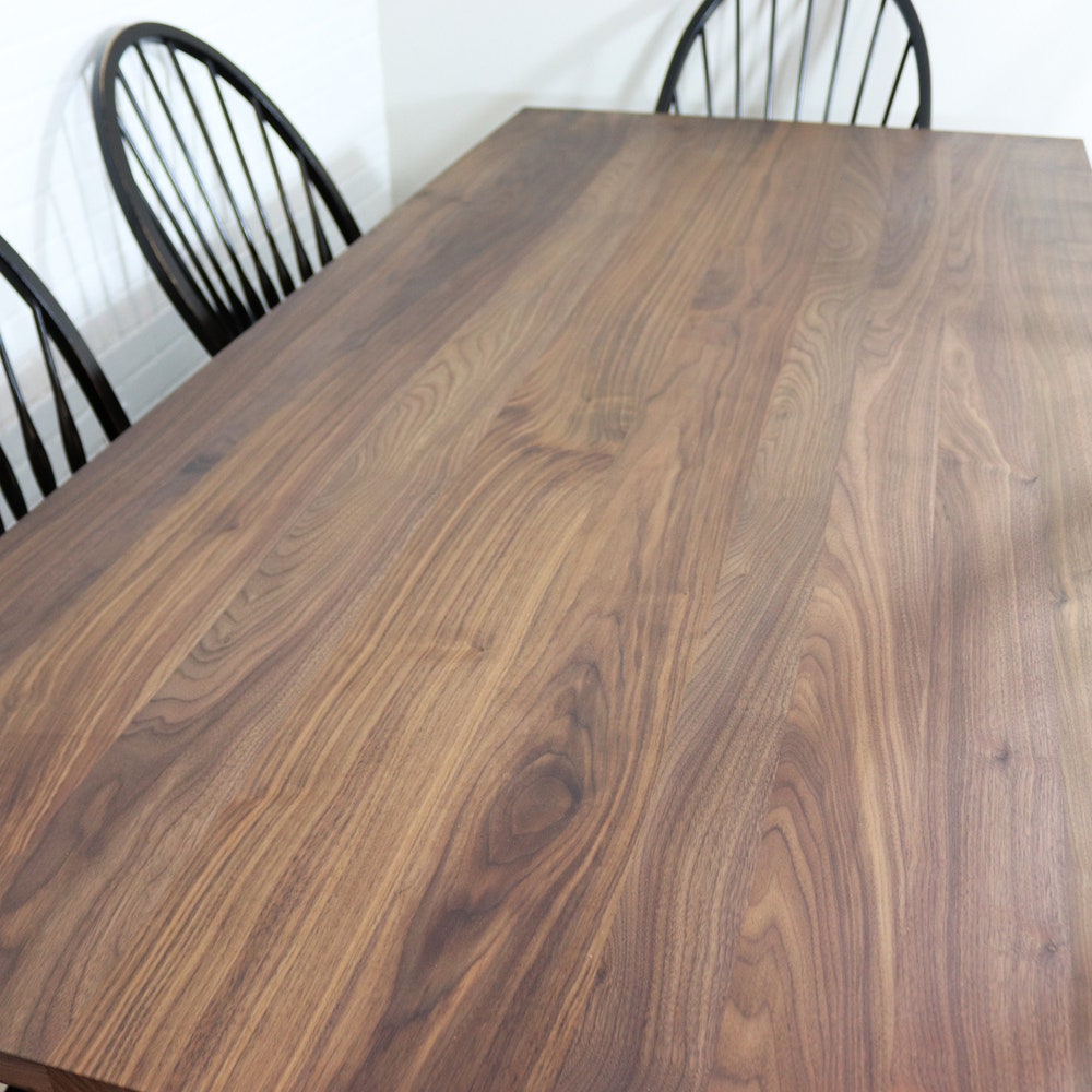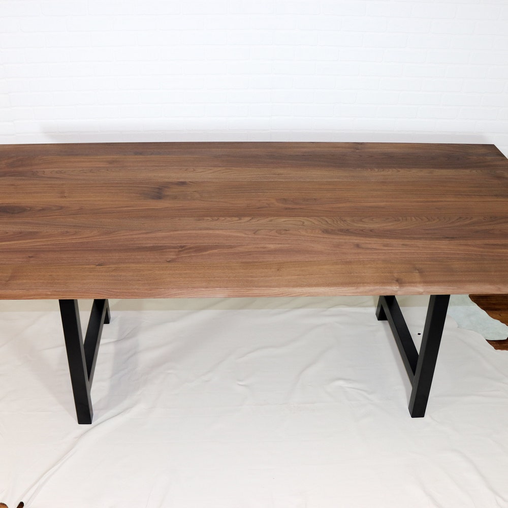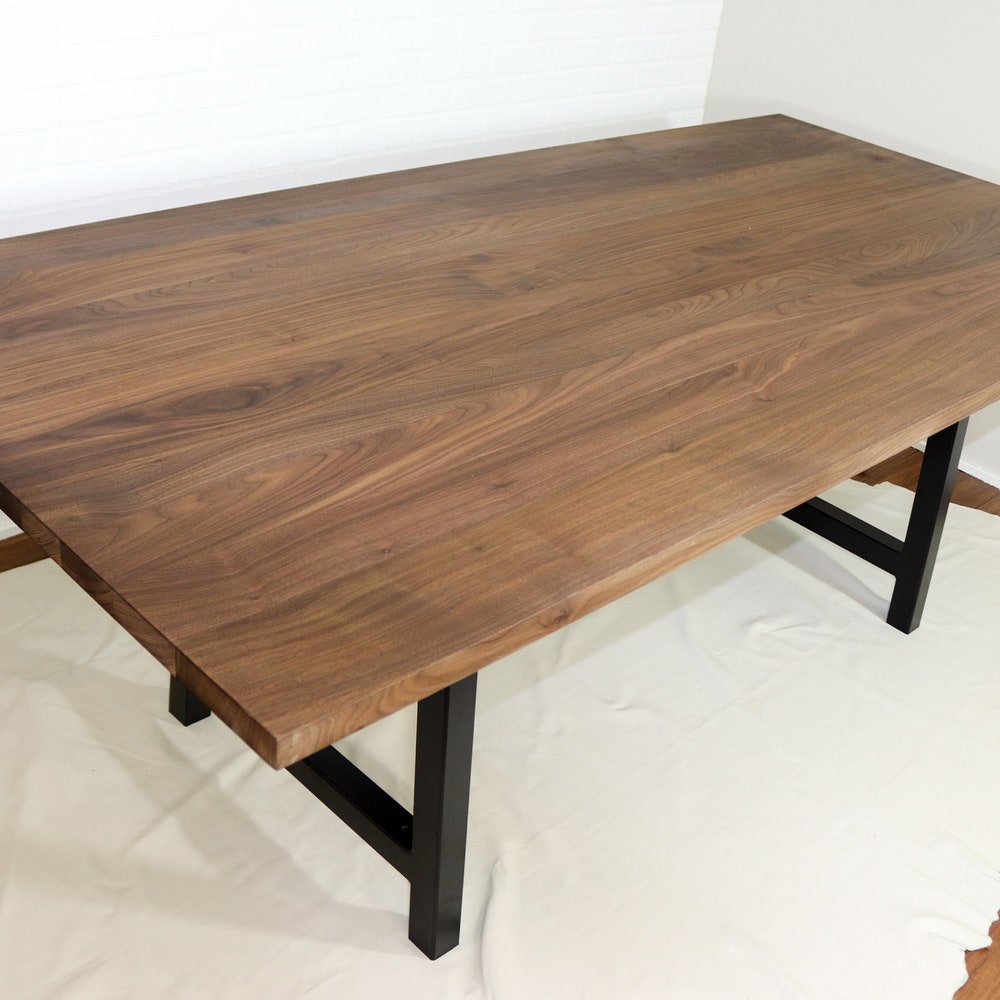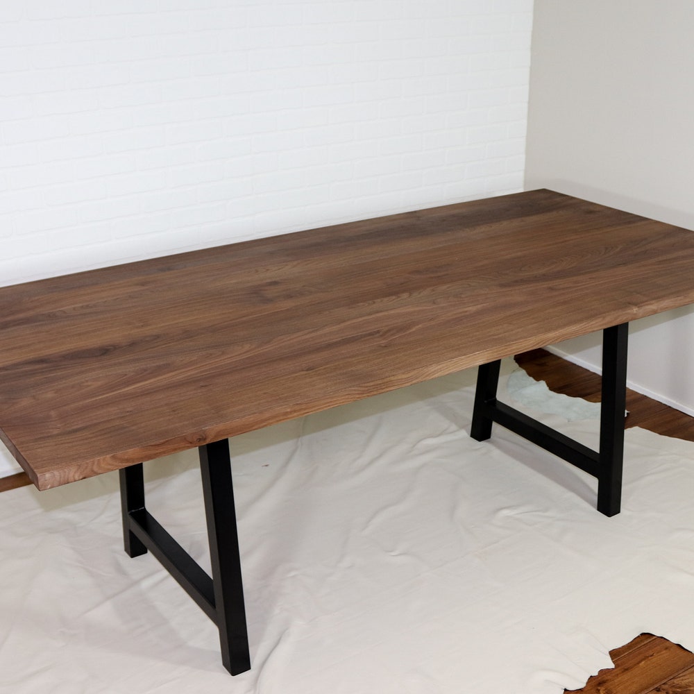 This walnut table is perfectly suited to a modern farmhouse style kitchen or dining room. The simple design of the walnut table top pairs well with black steel A frame legs for a modern farmhouse vibe. We build every table to order so there are many ways to make this table perfect for you.