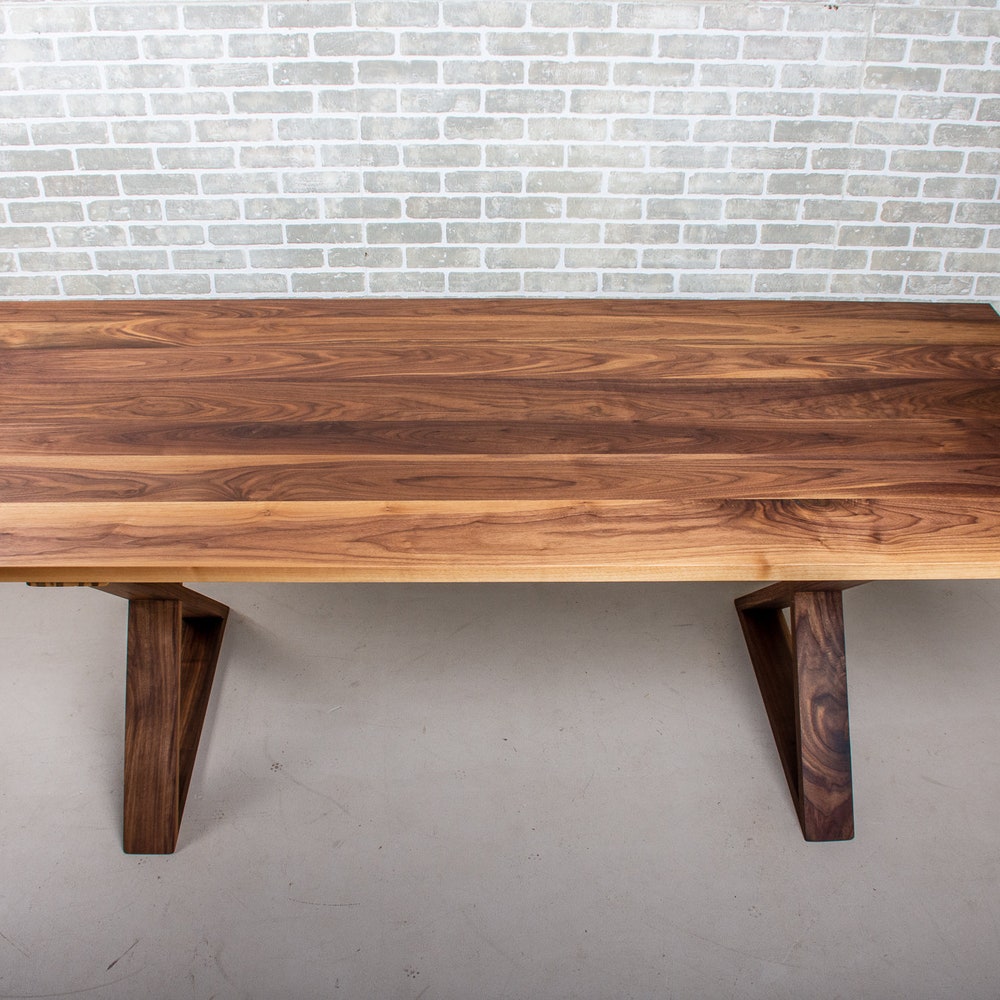 The farmhouse kitchen table has been given a modern update. Made of solid walnut this table is up for all your kitchen activities while bringing a lot of style. We build every table to order so there are many ways to make this table perfect for you.