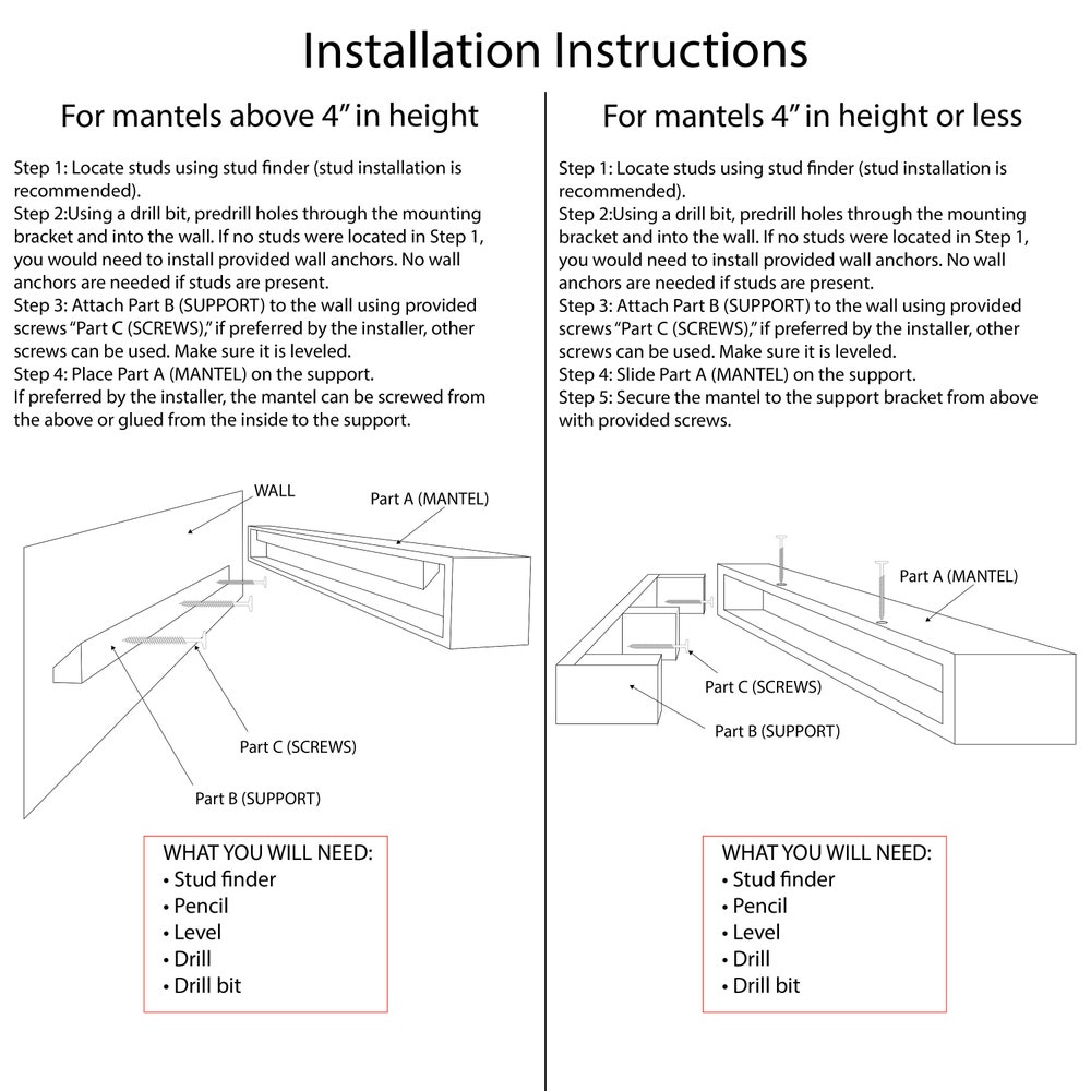 * Install the mantel at least 12″ away from the top of the fireplace box *