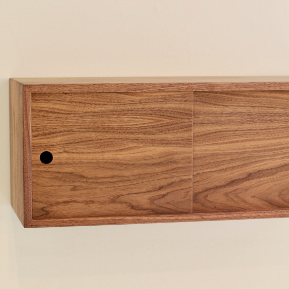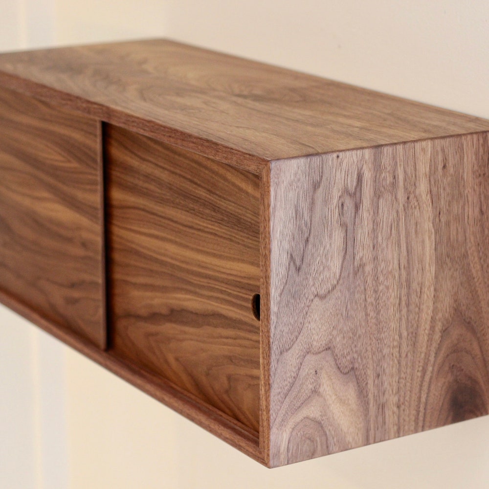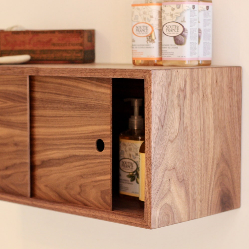 Our Floating Bathroom Storage Cabinet is handmade from solid Walnut with matching-grain veneer sliding doors. We build each piece from solid hardwood boards joined with a 45 degree miter creating a beautiful wrap-around continuous grain.