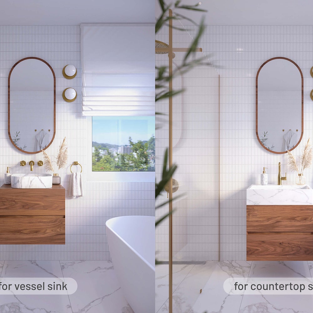 This model is ideal for vessel sinks and wall faucets. Optionally we can make it for countertop sinks with integrated faucets as well.