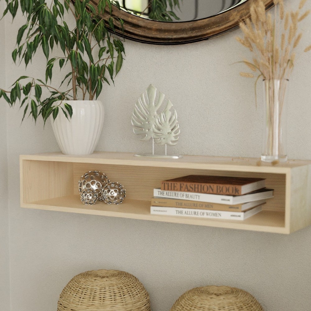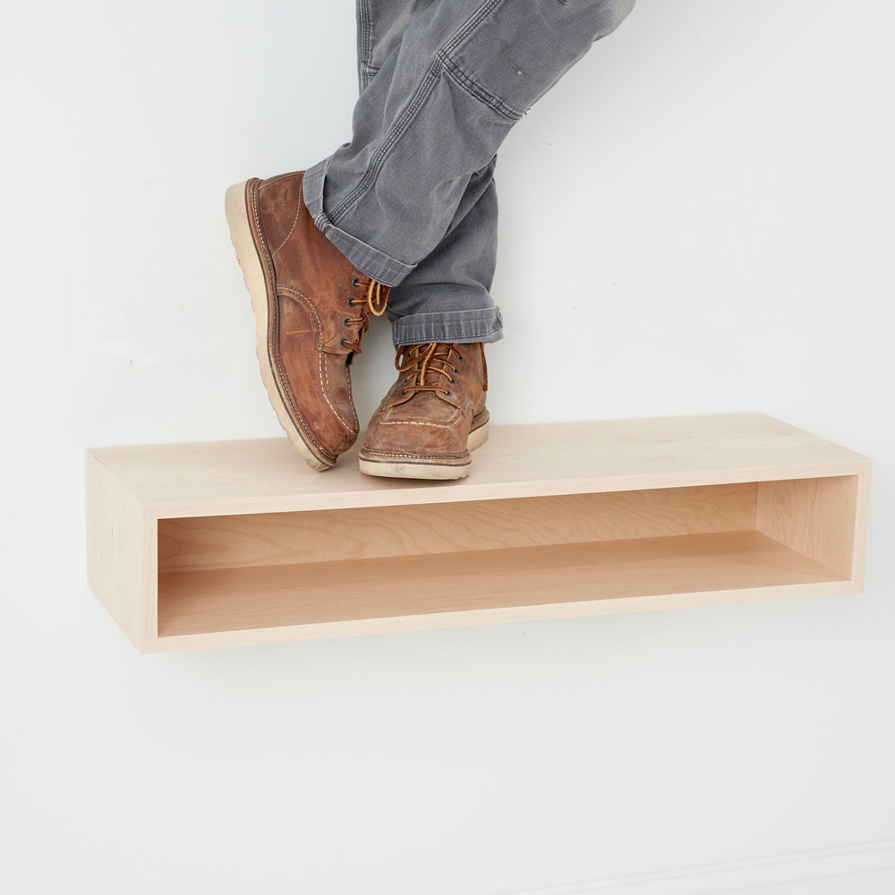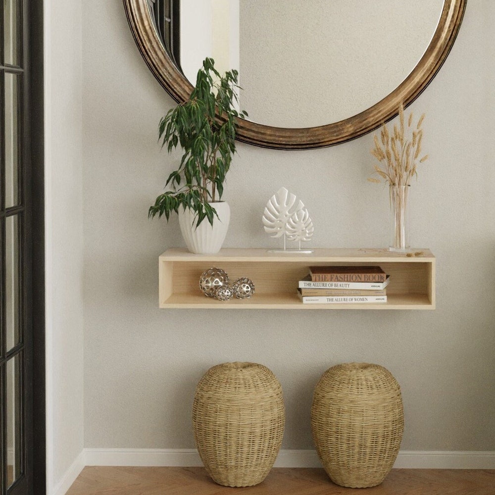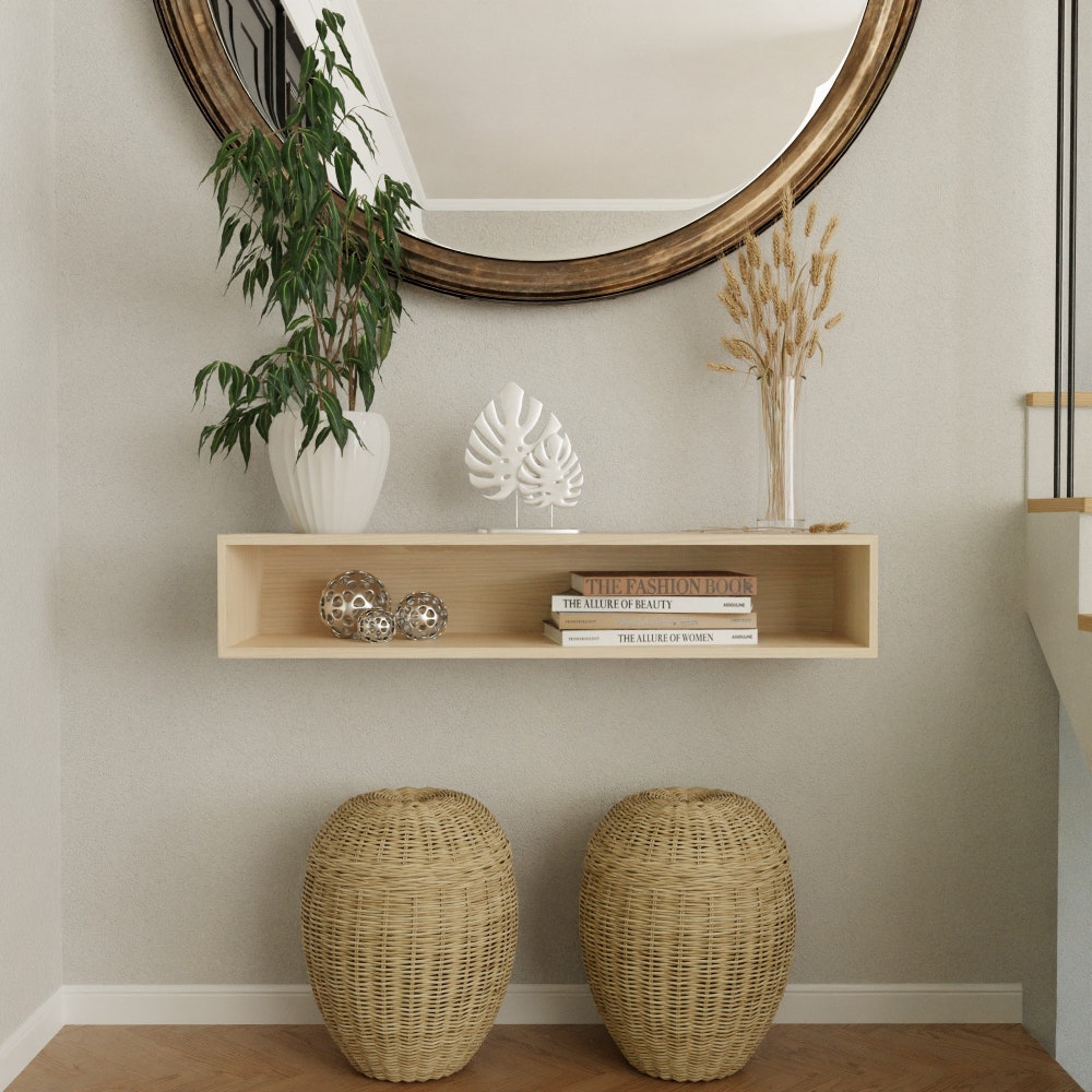 Our Scandinavian inspired floating Entryway Console Table is the perfect display organizer piece for a hallway, dining room or Bar. Handmade from solid Hard Maple with no visible hardware. We showcase a continuous wrap-around grain across the top and sides. We hand select the finest domestic hardwood (* the back is veneer ply for stability and seasonal movement).