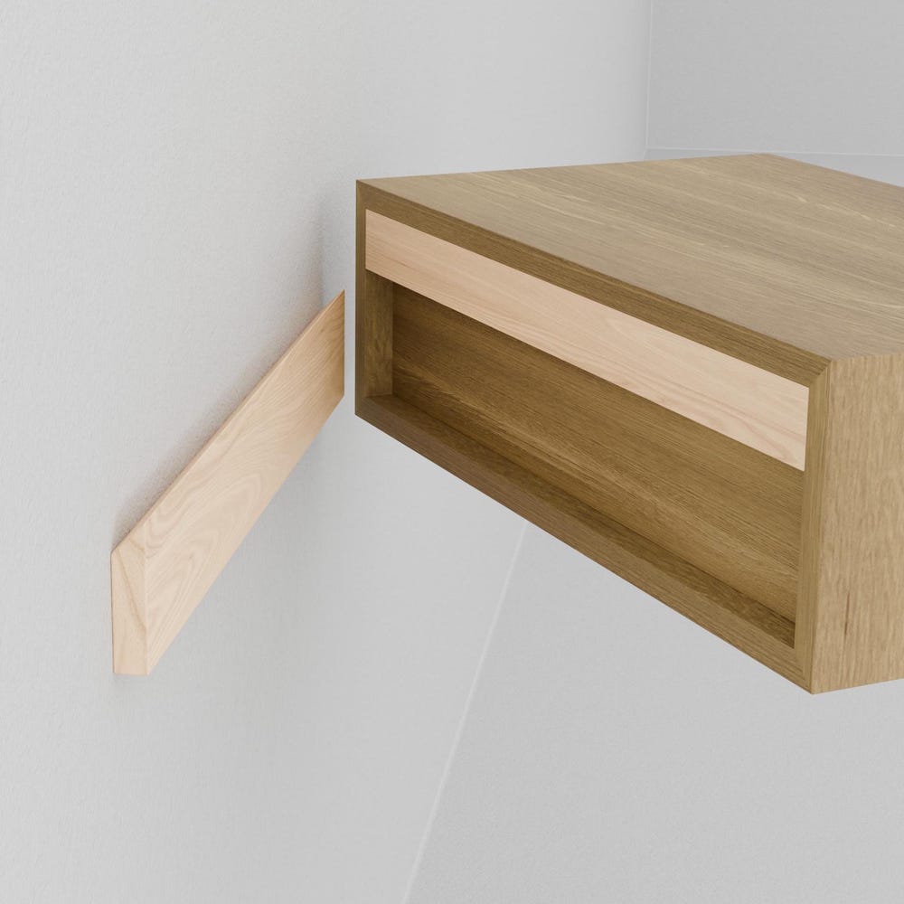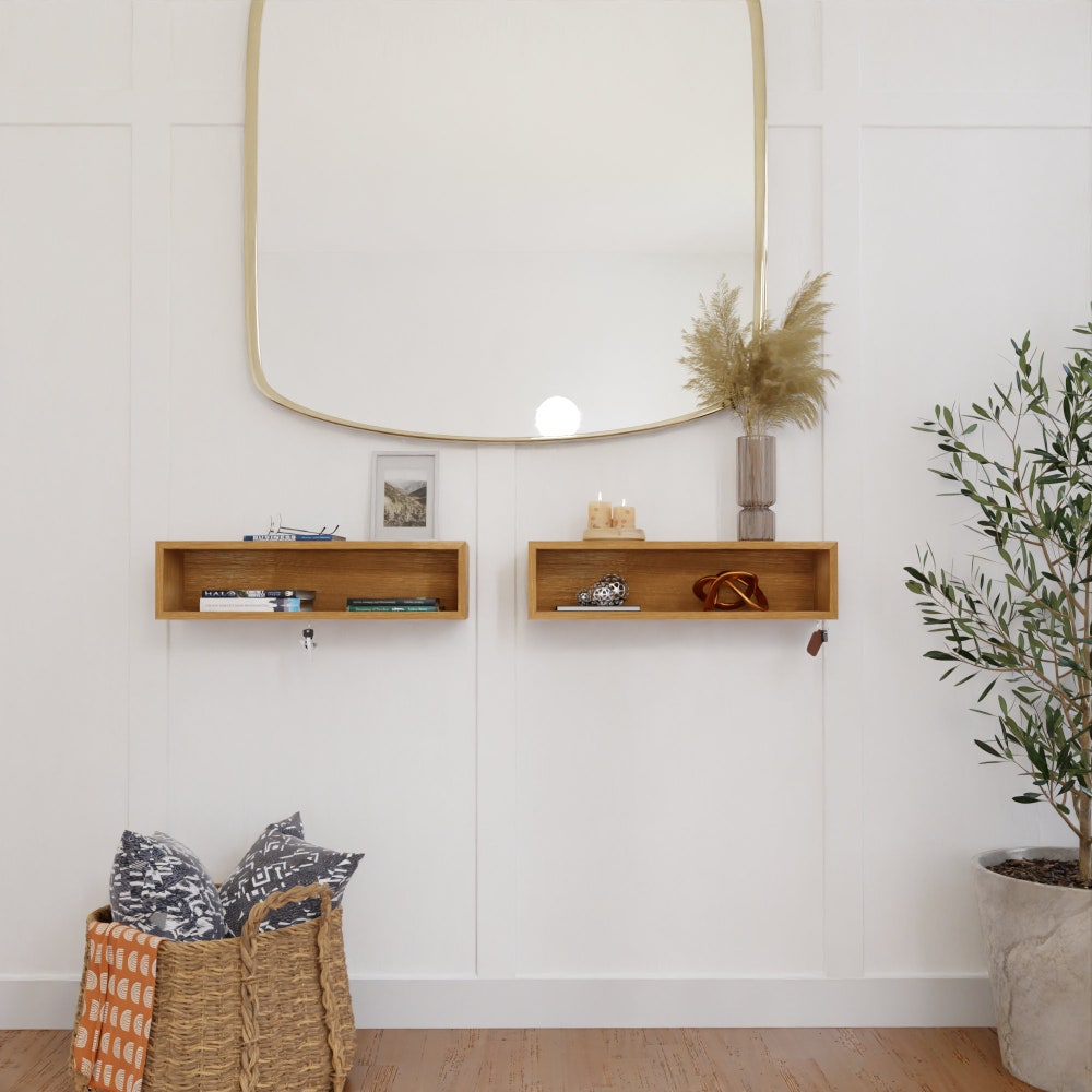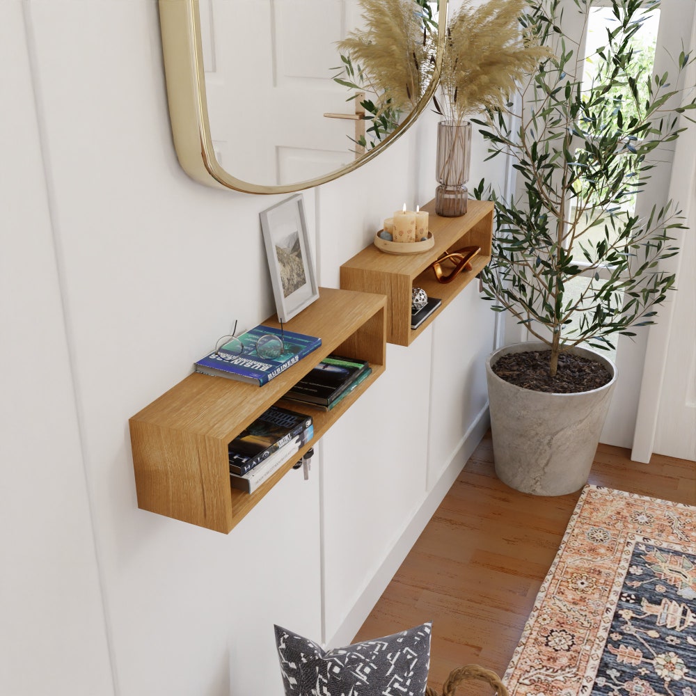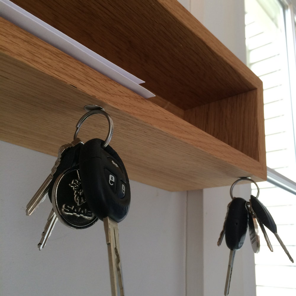Available in 5 lengths, these floating shelves mount quickly and easily with an integrated french-cleat. We embed 3 rare-earth magnets on the underside for keys. The shelf depth is perfect for sunglasses, wallets, phones and your mail.