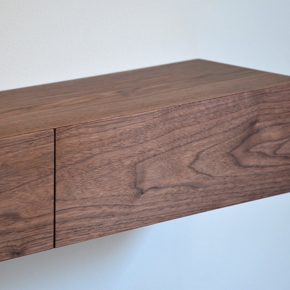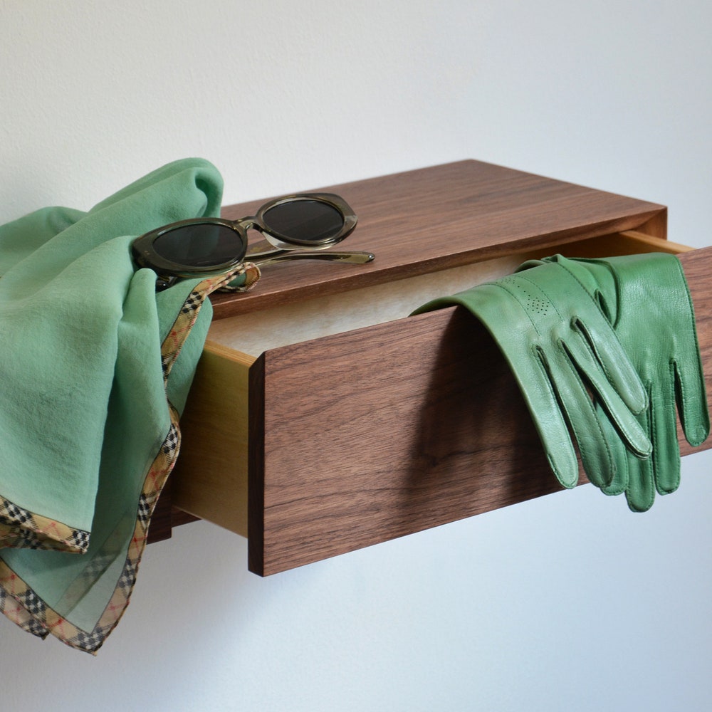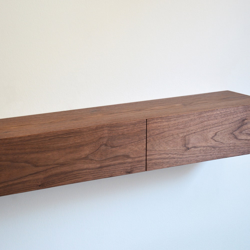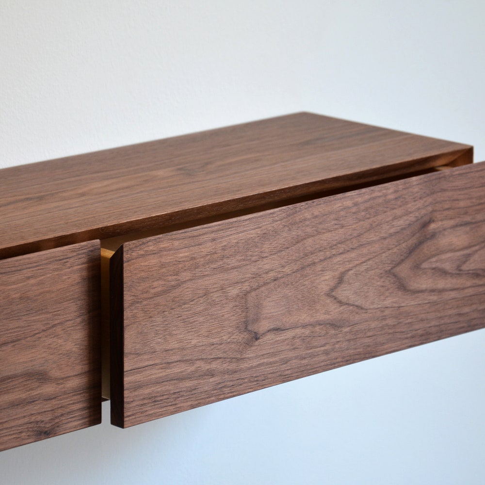 Floating entryway shelf / narrow entryway table with hidden drawers, made of walnut
