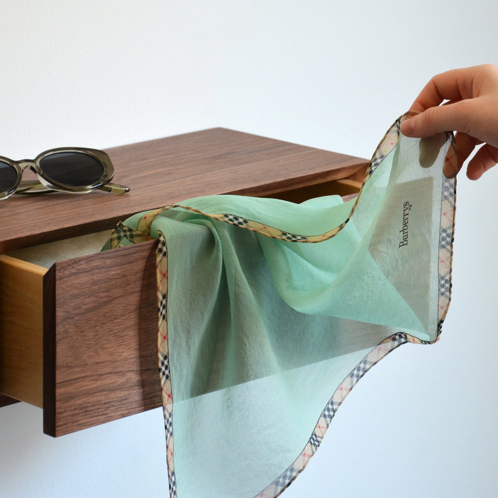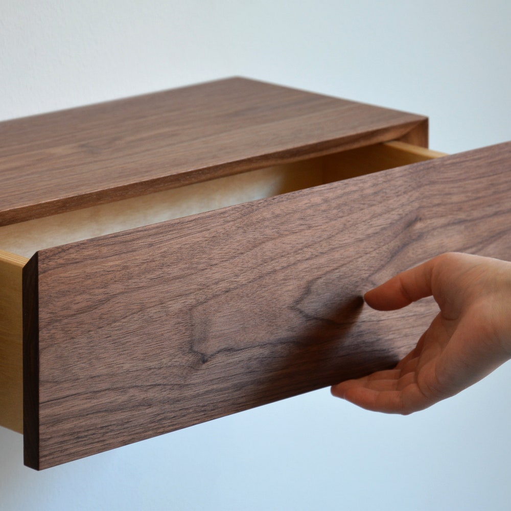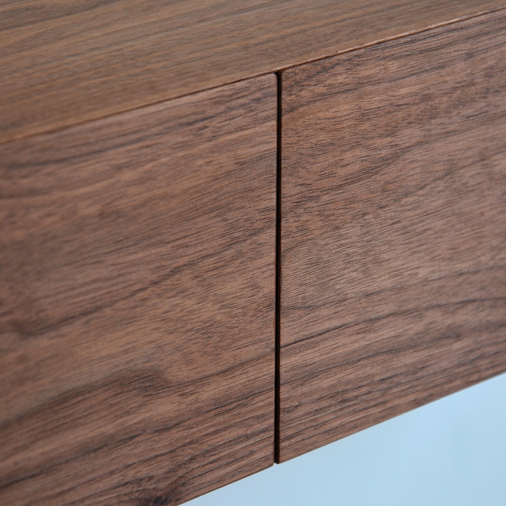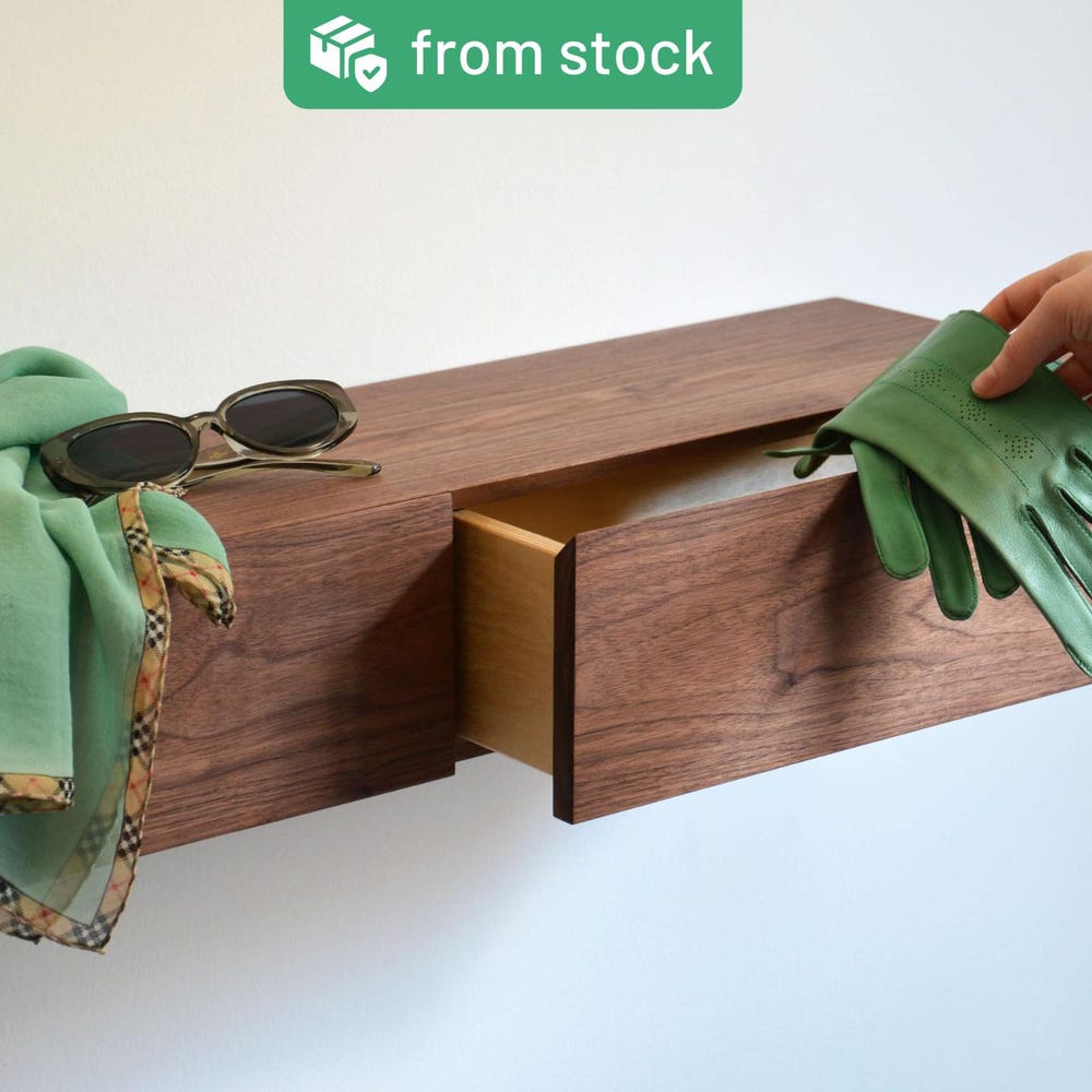 Floating entryway shelf / narrow entryway table with hidden drawers, made of walnut
