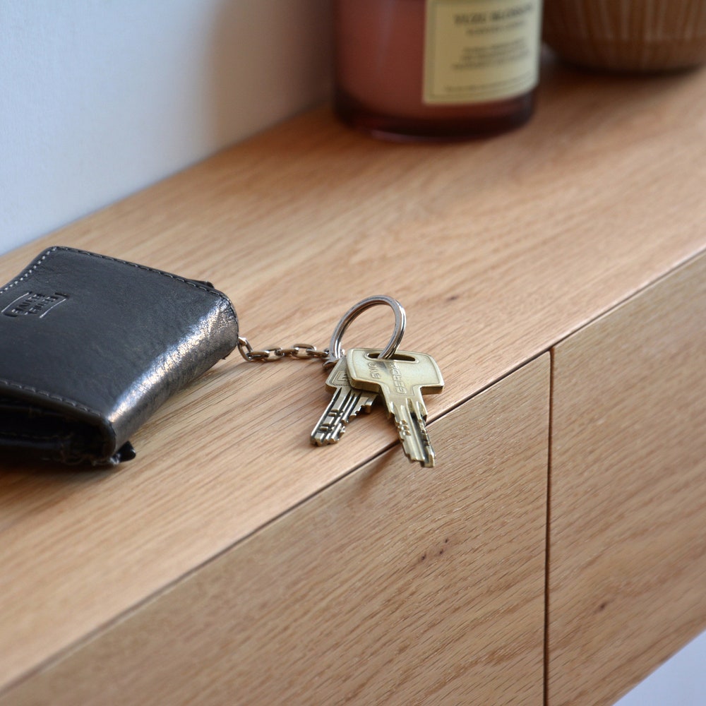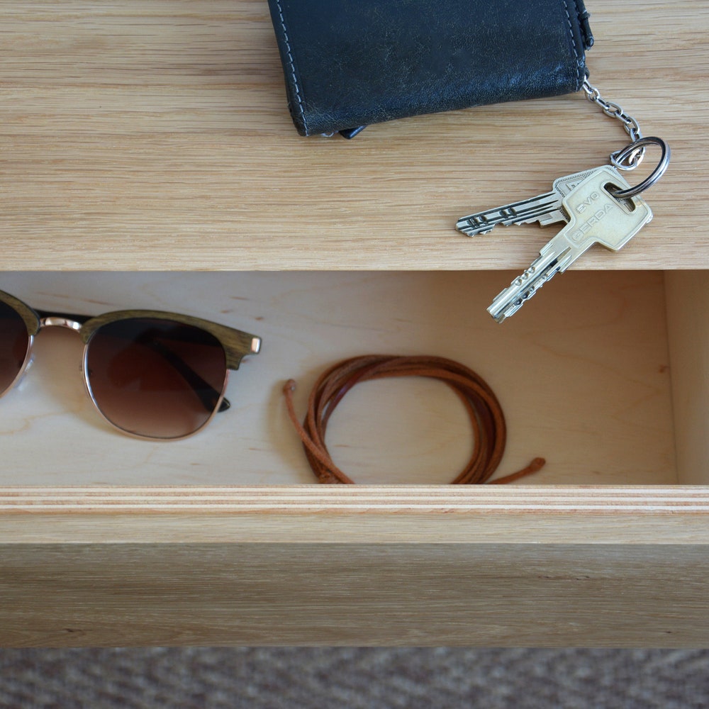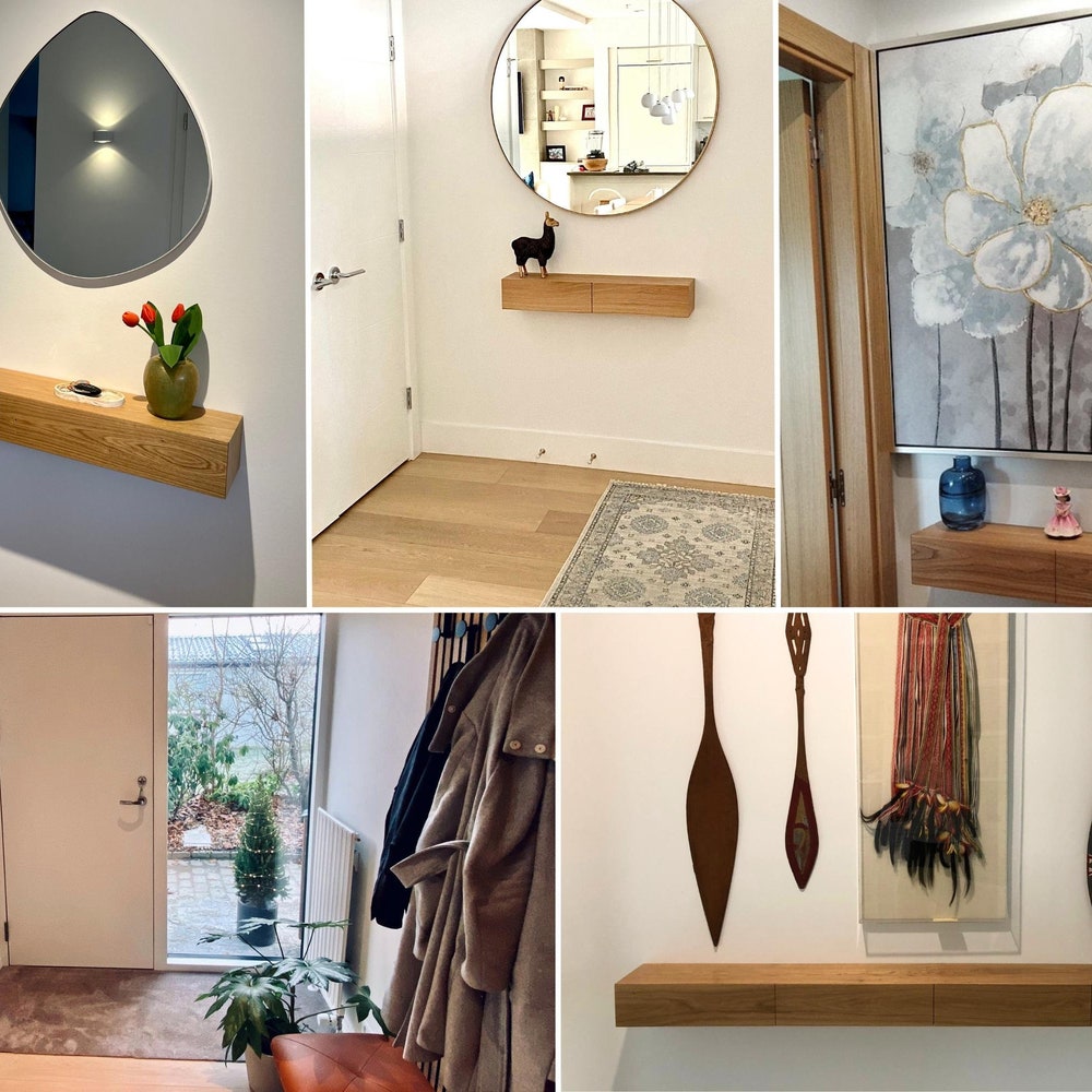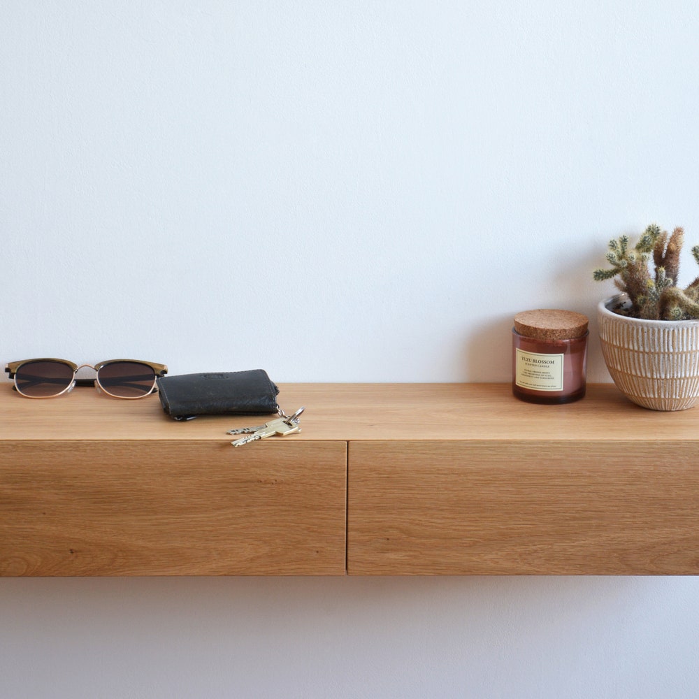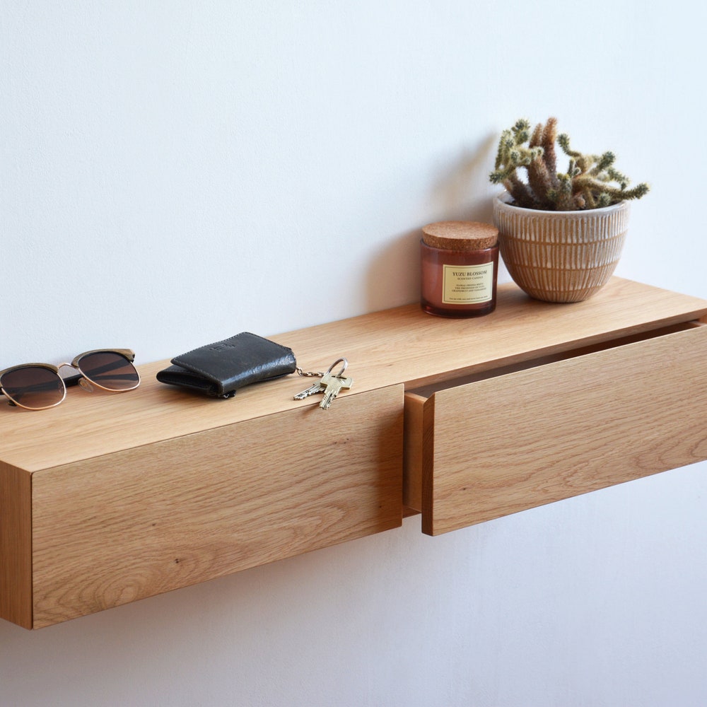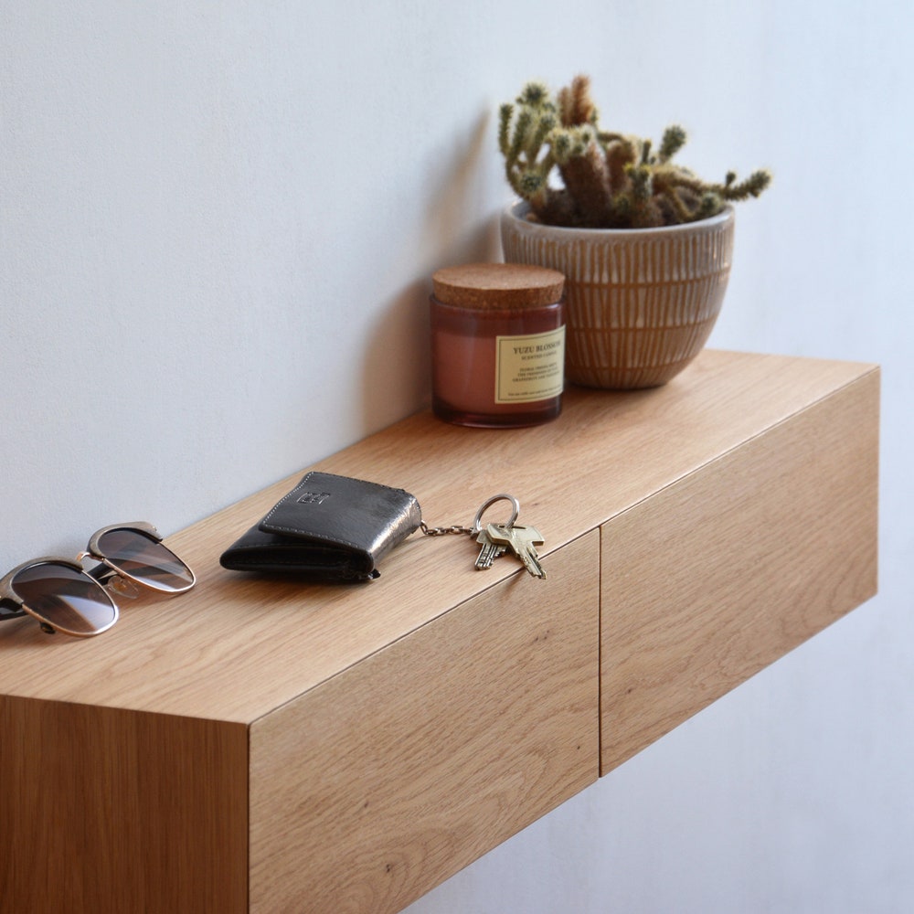 Floating entryway shelf with hidden drawers / narrow entryway table made of solid oak