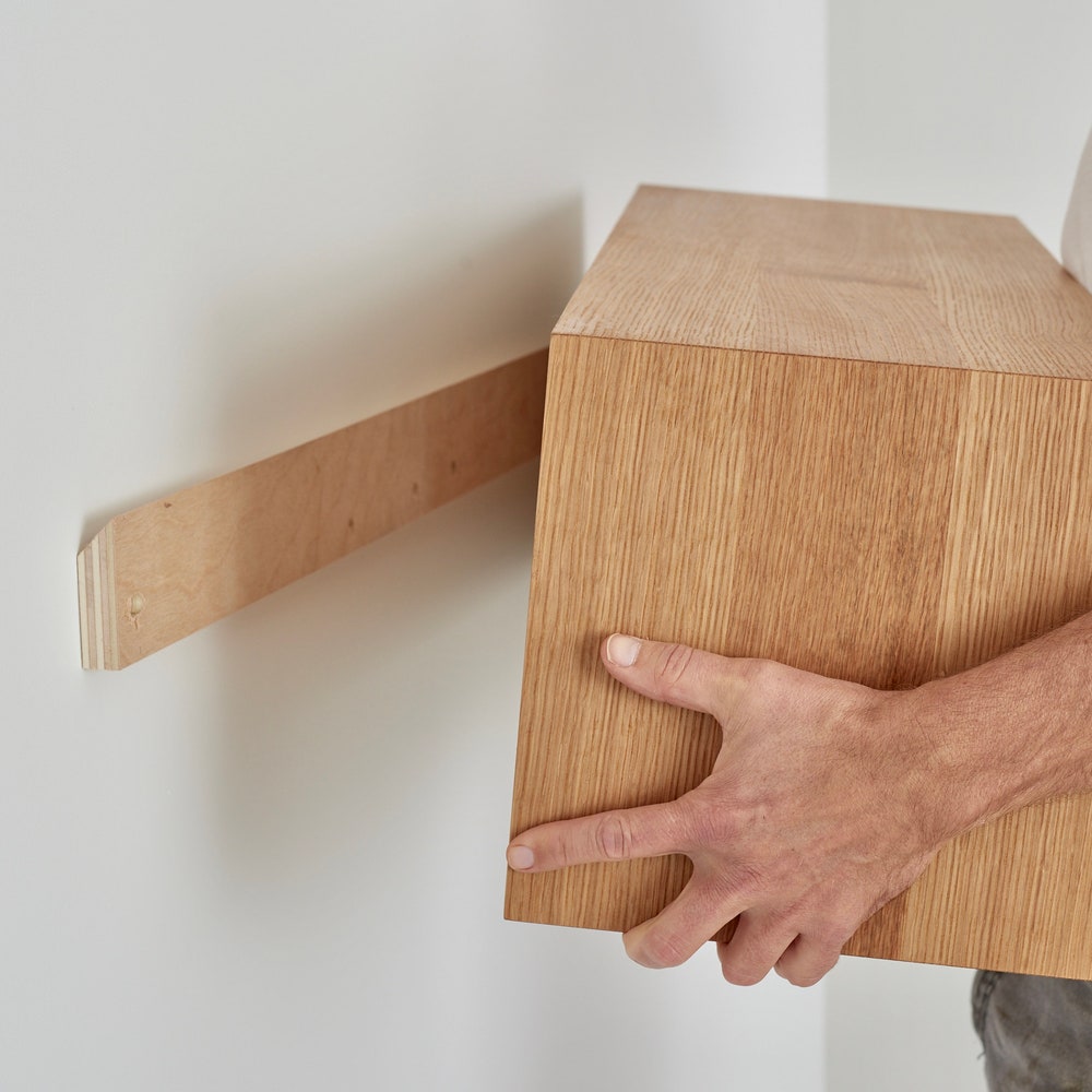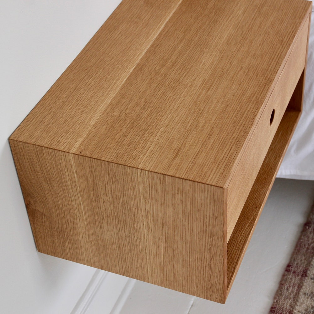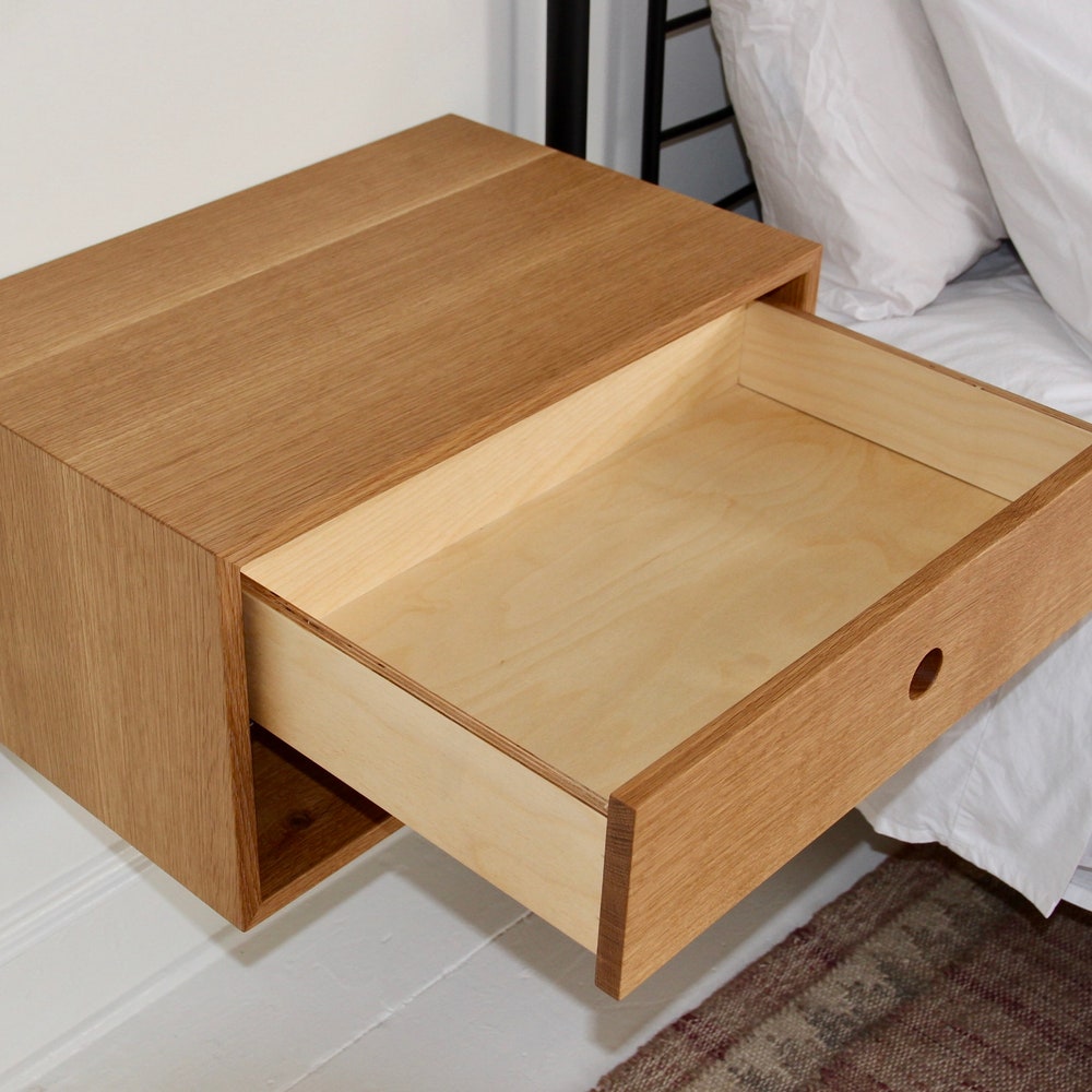 Our Floating Nightstand is Mid-Century Modern inspired and is built by hand from solid White Oak, grown and milled domestically. It mounts easily to your wall using a French cleat (Included) for a beautiful floating appearance. Now with double drawers! See separate listing in our shop for single drawer/open shelf version