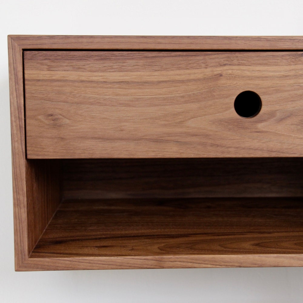 Our Floating Nightstand is Mid-Century Modern inspired and is built by hand from solid Black Walnut, grown and milled domestically. It mounts easily to your wall using a French cleat (Included) for a beautiful floating appearance.