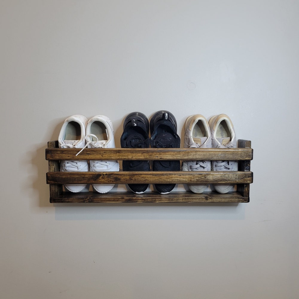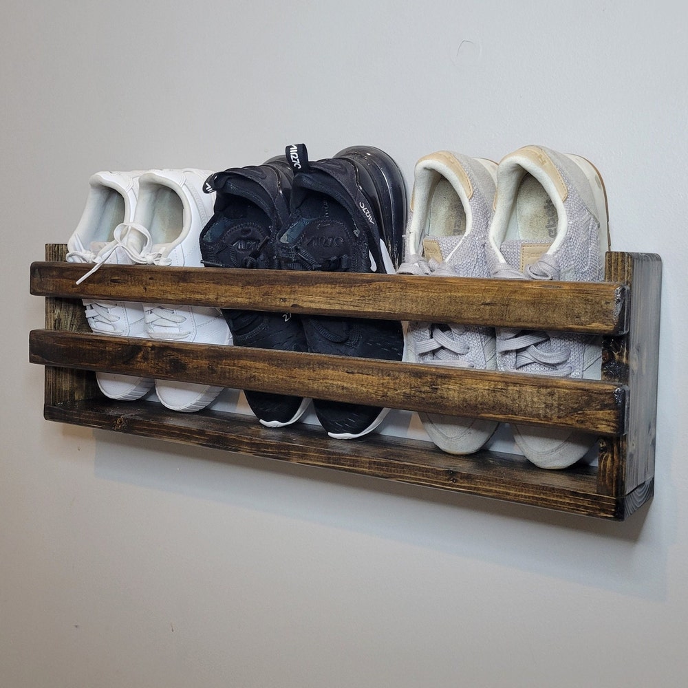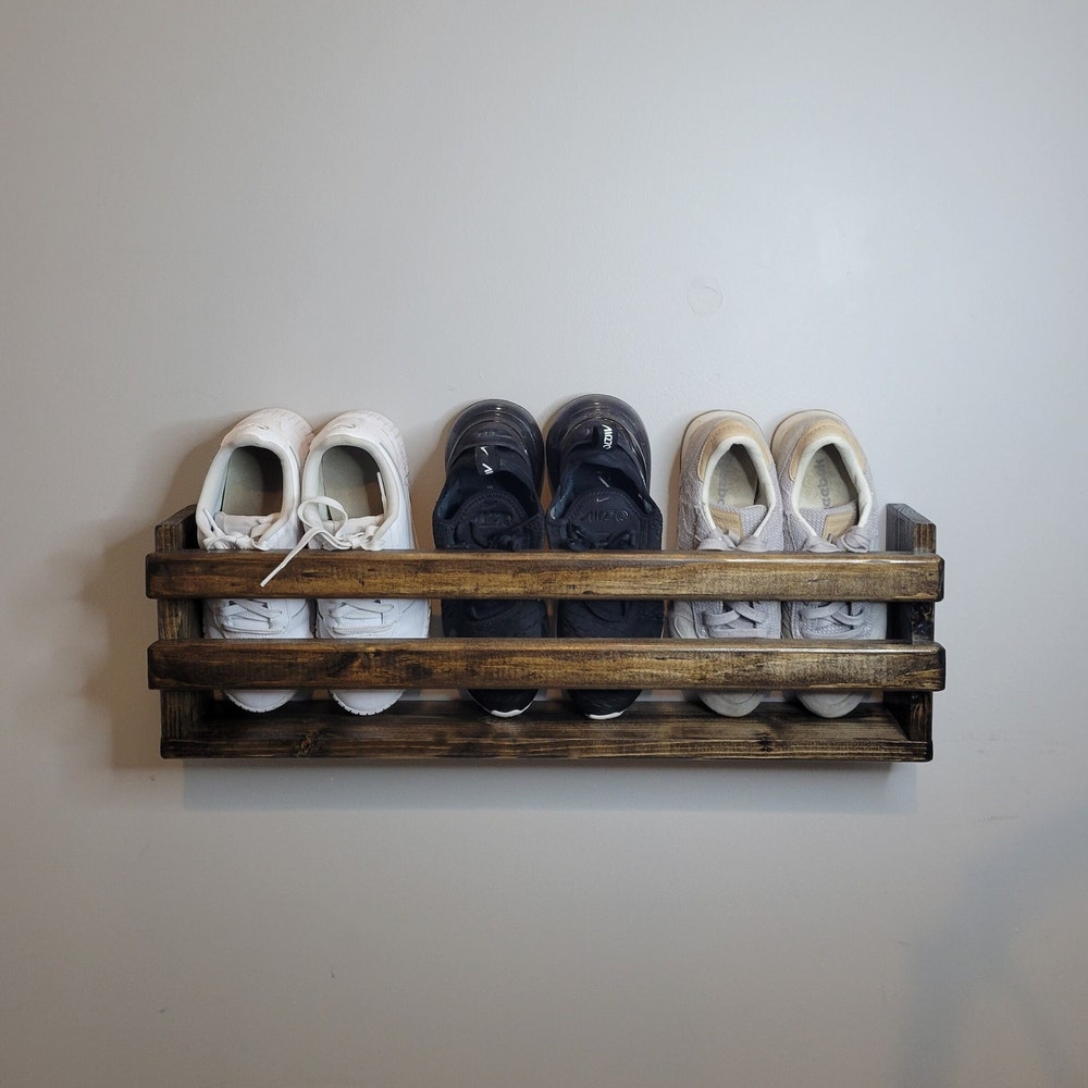 2-Tier Wall Mounted Shoe Rack – Solid Wood Floating Shelf – Minimalist Entryway Organizer – Handmade Double Shoe Storage Shelf