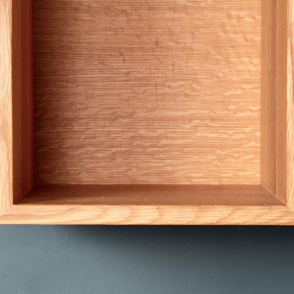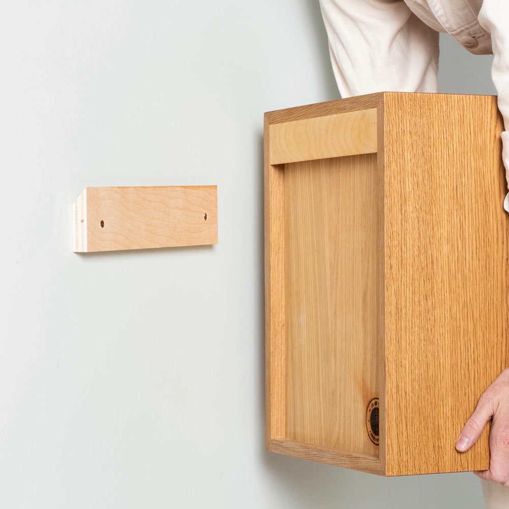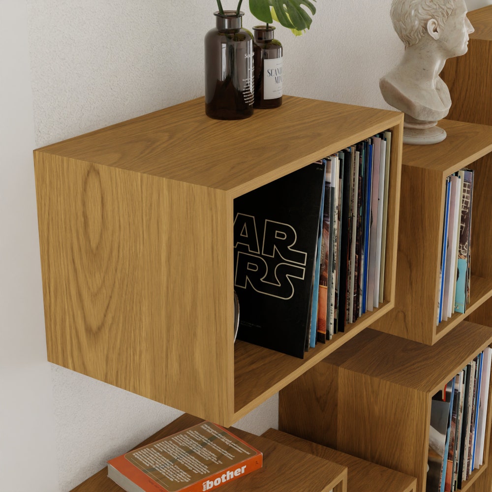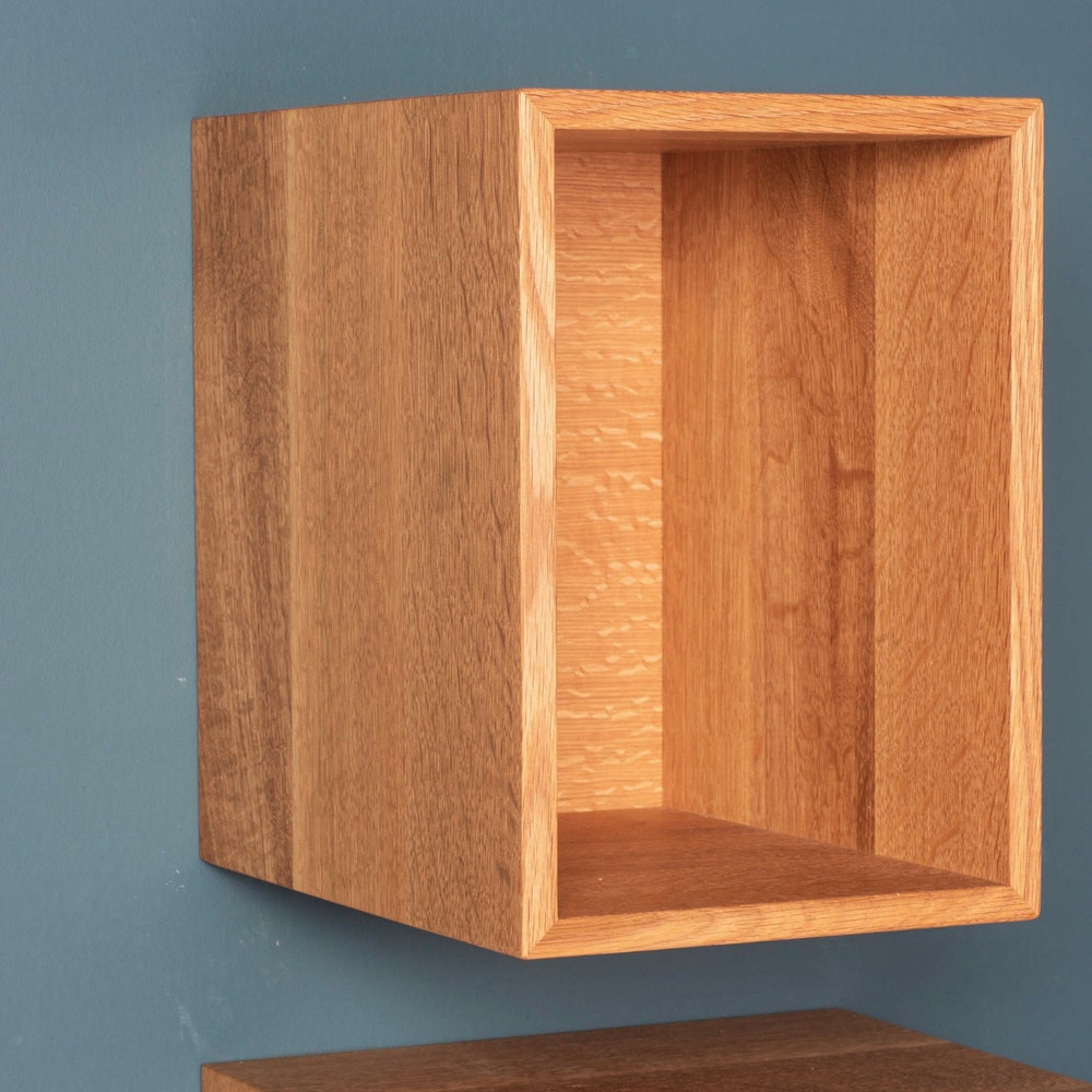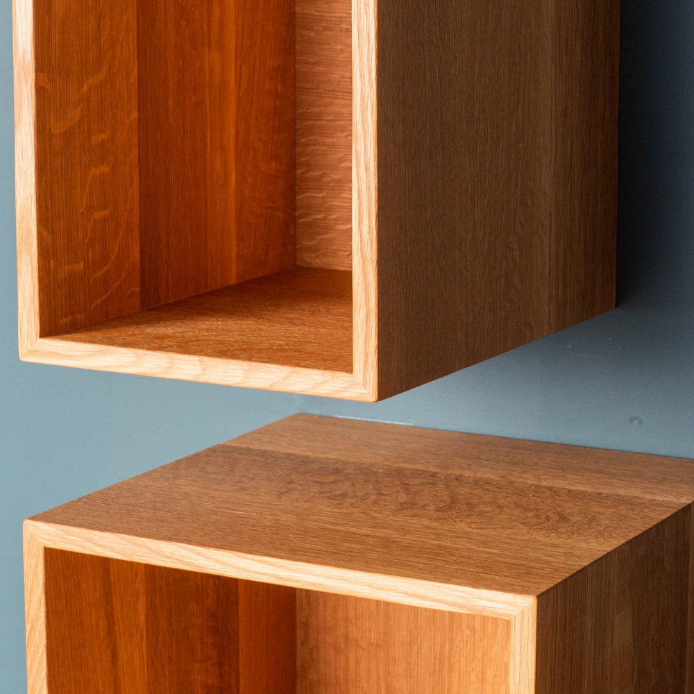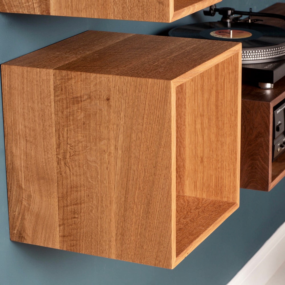 These wall-hung record shelves are built from solid American White Oak and feature wrap-around grain across the top and sides. Clean, elegant and Mid-Century modern inspired.