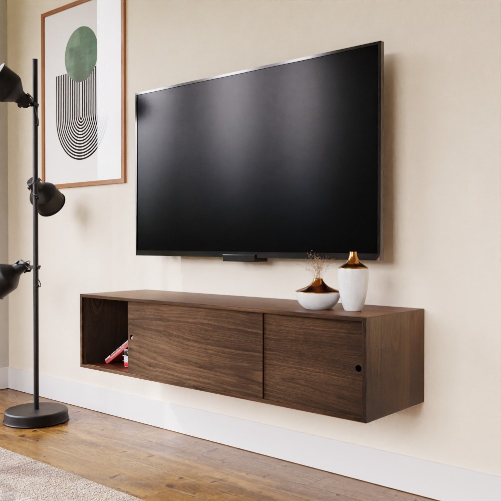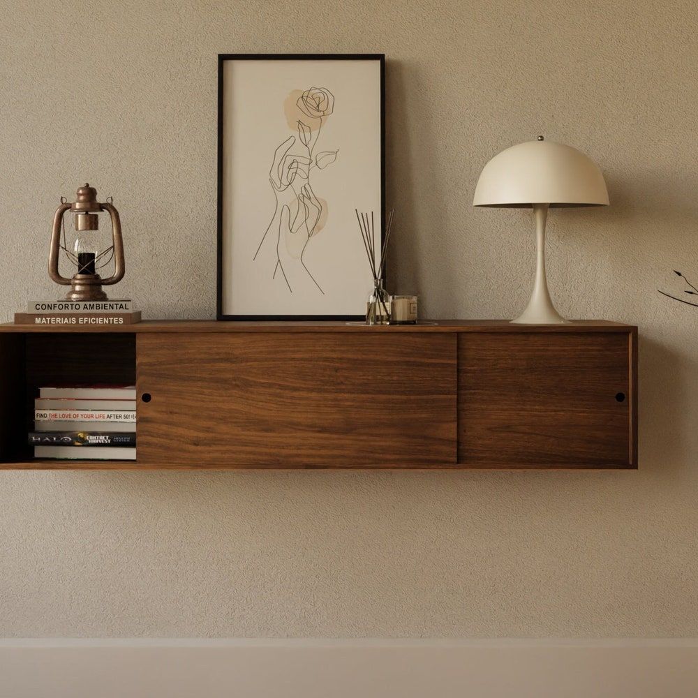 Floating Walnut Credenza Sideboard Bar Cart with Sliding Doors