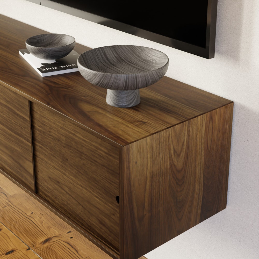 This Floating Credenza / sideboard is the perfect piece for displaying and storing barware, China or even serve as a media cabinet. Built from solid American Black Walnut with beautiful wrap-around grain across the top and sides. Neatly hide your electronics and dress up the room at the same time.