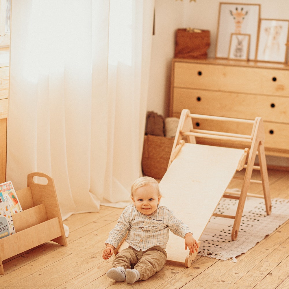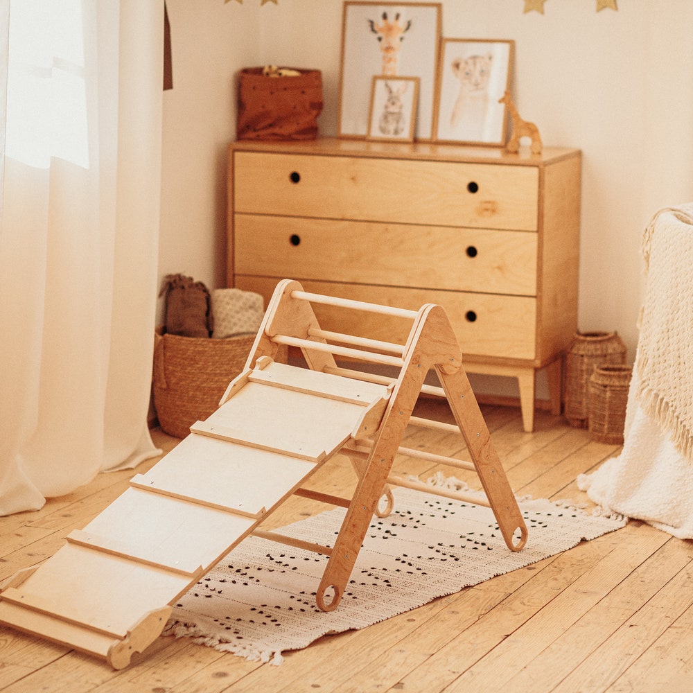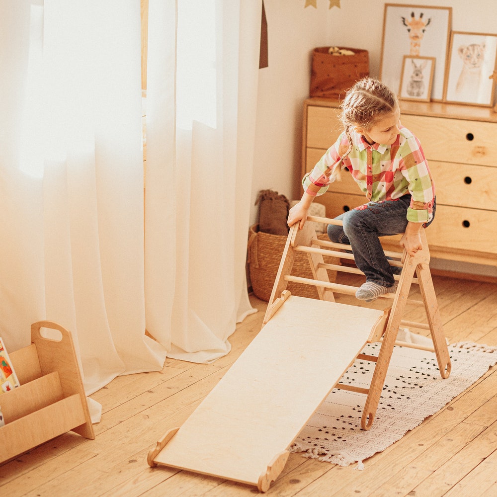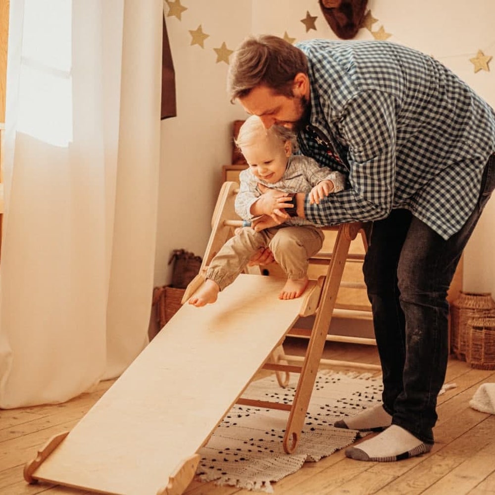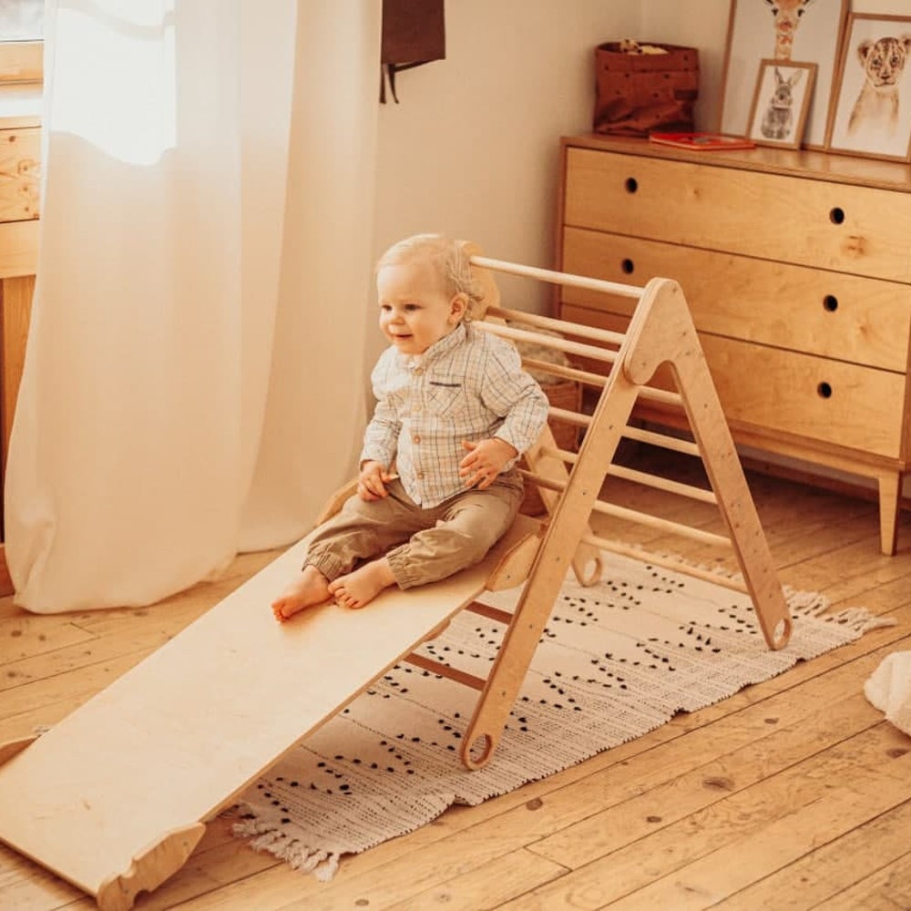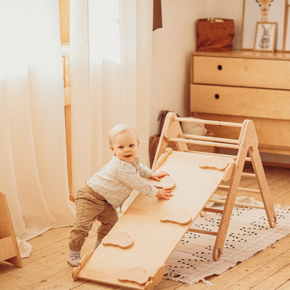 Foldable Climbing Triangle with Wooden Ramp and Slide, Wood play gym Montessori furniture Balance board Baby climber Eco Waldorf toys