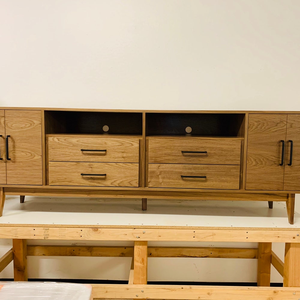 Made with a combination of top grade walnut veneer and solid walnut wood legs and handles. All walnut surfaces are sealed with a clear satin finish. Snap close hinges are used on all doors and soft close drawer glides. Drawer boxes are made of Baltic birch wood and are dovetail jointed. When working with any organic material like wood, each piece will have its own unique characteristics and tone.